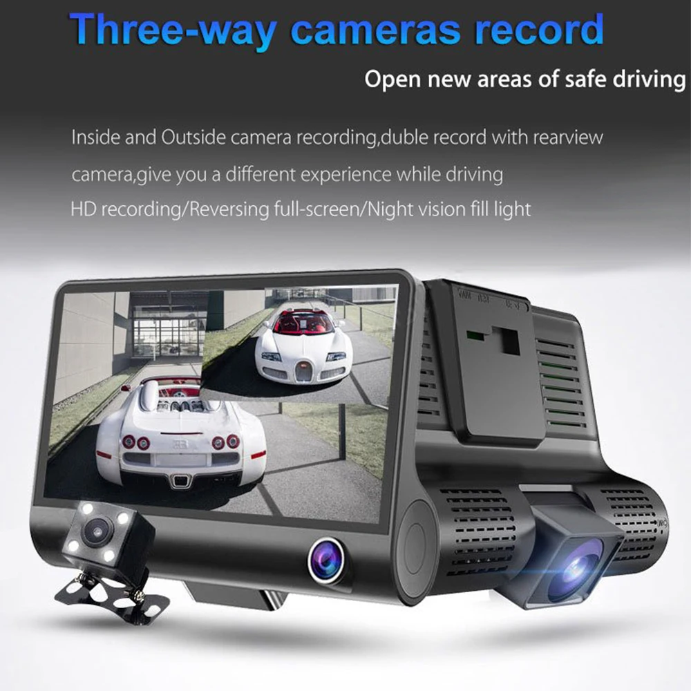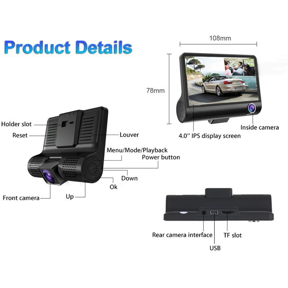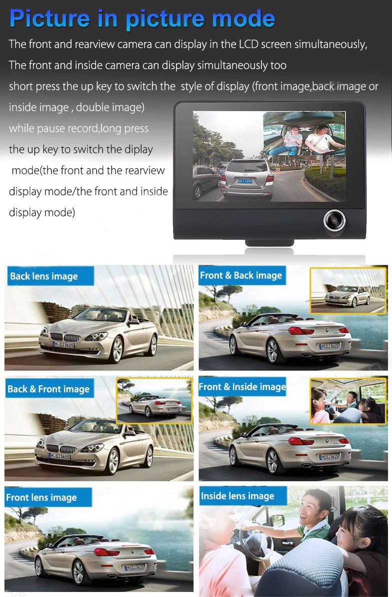 The front + inside lens is recorded at the same time, the front lens is wide-angle at 170deg, the inside lens is wide-angle at 120deg, Enjoying happy travel with families ,don't forget to record all happy videos timely.