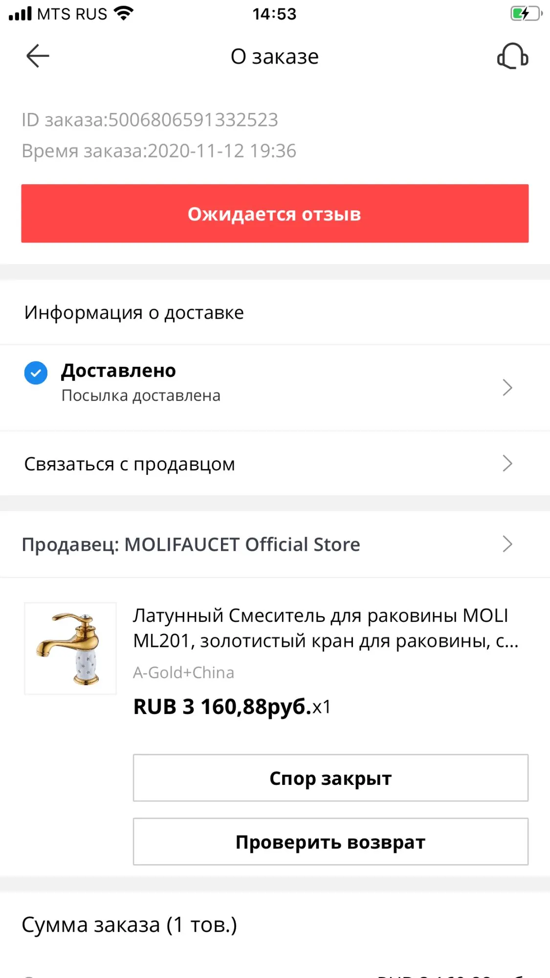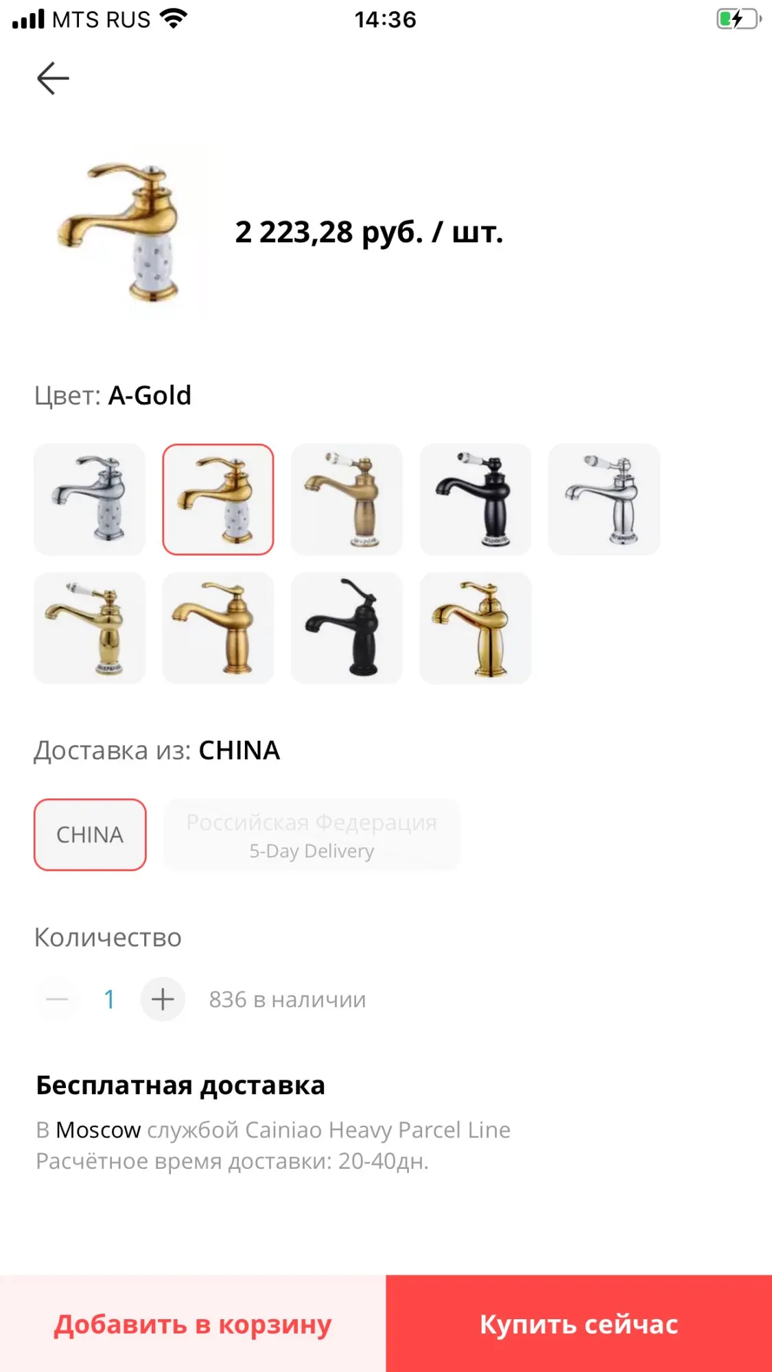 Мой первый неудачный заказ! Заказывала в золоте с белым декором, а пришёл некачественный, дешевый, легкий и совсем не тот кран.(См.фото1) Заказ оформляла в чёрную пятницу за 3160,88, видимо продавец в ЧП сделал накрутку , так как сейчас можно купить такой кран у него же намного дешевле, за 2223,38руб. Мне предложили либо полный возврат моих средств , но кран я должна вернуть в Китай за свой счёт-узнала на почте-это отправка «мелкого пакета» мне обойдётся в 1350руб., либо продавец мне возвращает часть моих средств 1580,44 руб. Почему я должна вкладывать свои средства, чтоб исправить их ошибку, которую они признали???? Поэтому сначала подумайте , прежде чем заказывать у этого продавца. Лучше тогда заказать у того продавца, у которого есть гарантия «бесплатный возврат», жаль, что я раньше об этом не знала.
