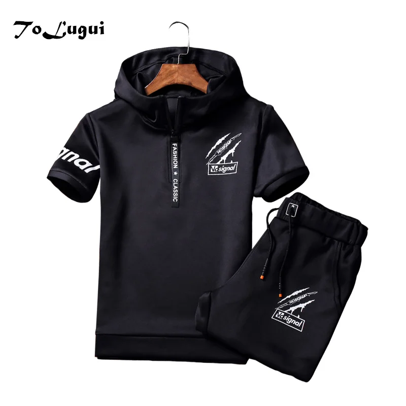 Мужская спортивная одежда с коротким рукавом, толстовка с капюшоном и штаны, 2018 брендовая мужская одежда, ветрозащитный дышащий спортивный костюм, комплект пуловера US $17,66