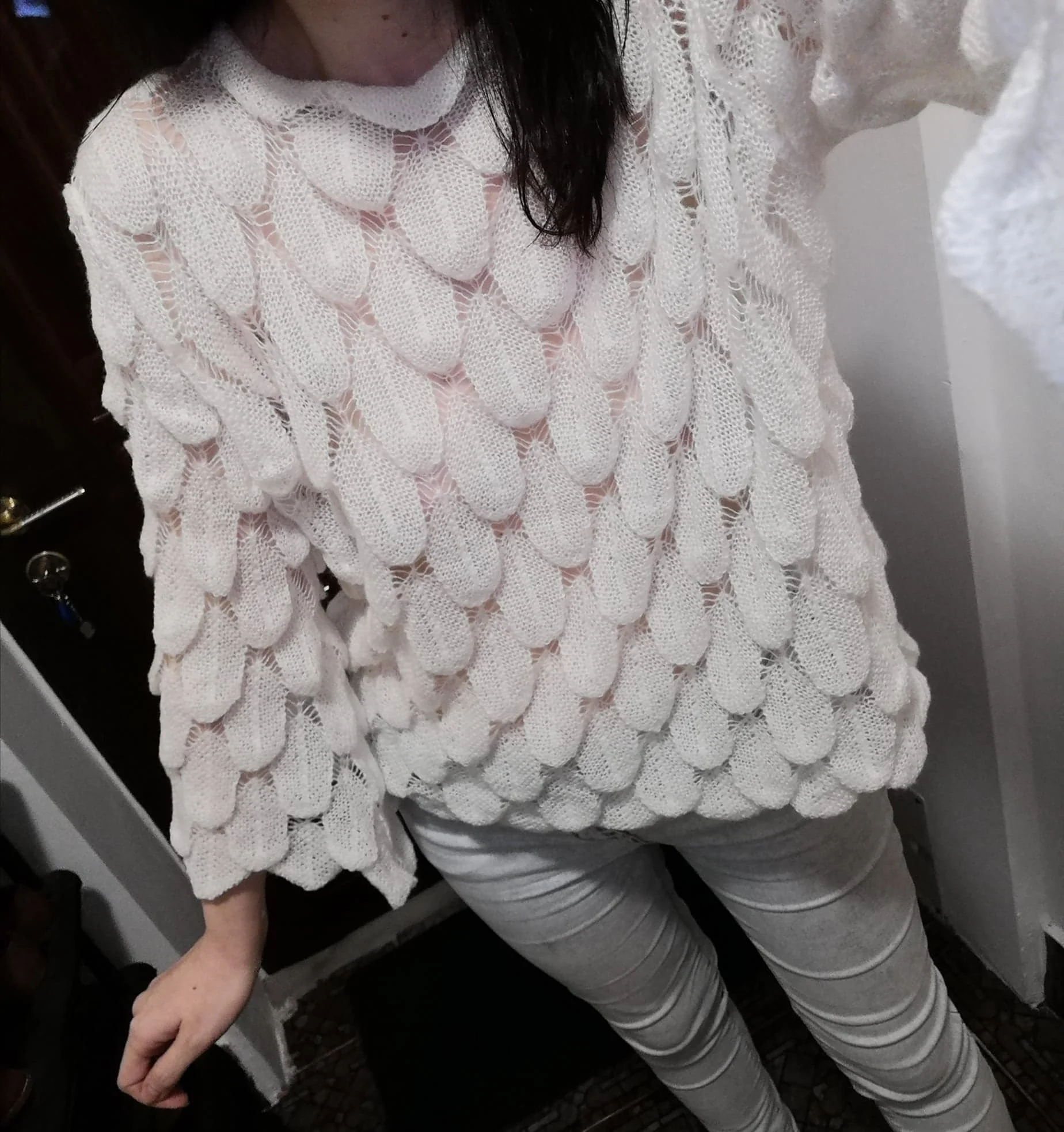 очень красивый ажурный свитер . тоненький . легкий . по размеру большеват мне . вообщем классный !!! спасибо продавцу !!!