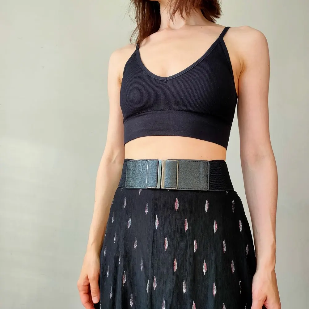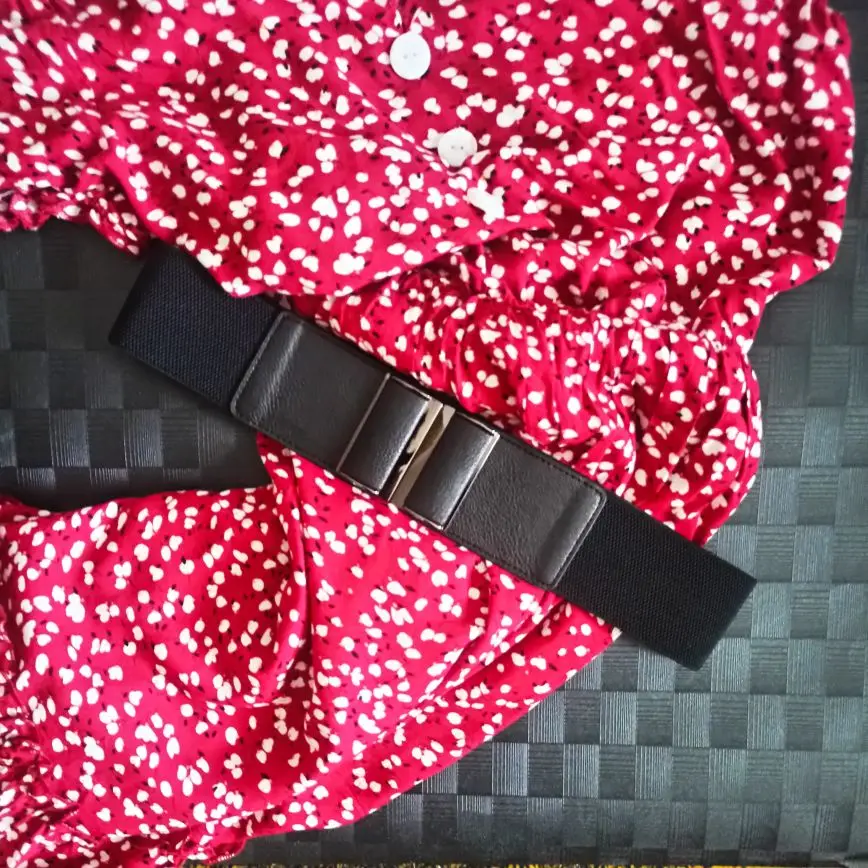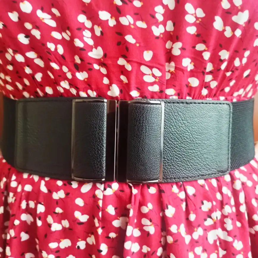 Ремень из широкой эластичной резинки с отделкой эко кожей. Удобная пряжка, легко застегивается и крепко держится на талии Резинка прочная, широкая и плотная. Ремень хорошо смотрится и подчёркивает линию талию Доставка очень быстрая У продавца на выбор множество вариантов этой модели