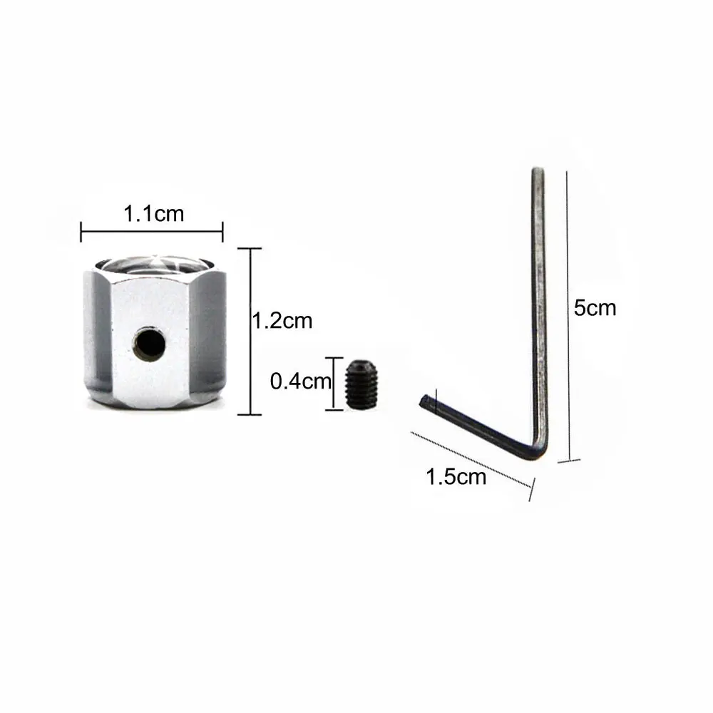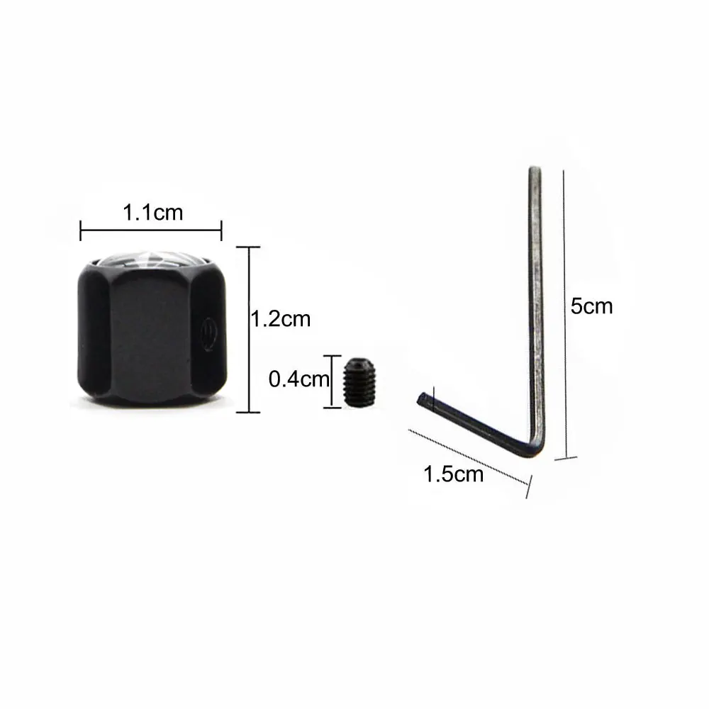 5. Комплектация: 5 шт./компл. (колпачки клапанов 4 шт, 1 гаечный ключ и 4 противоугонных винта); Размер: 4,8*1,5 см/1,8*0,59 дюйма (мини); Вес: 26 г; Цвет: черный/серебристый (цинковый сплав)