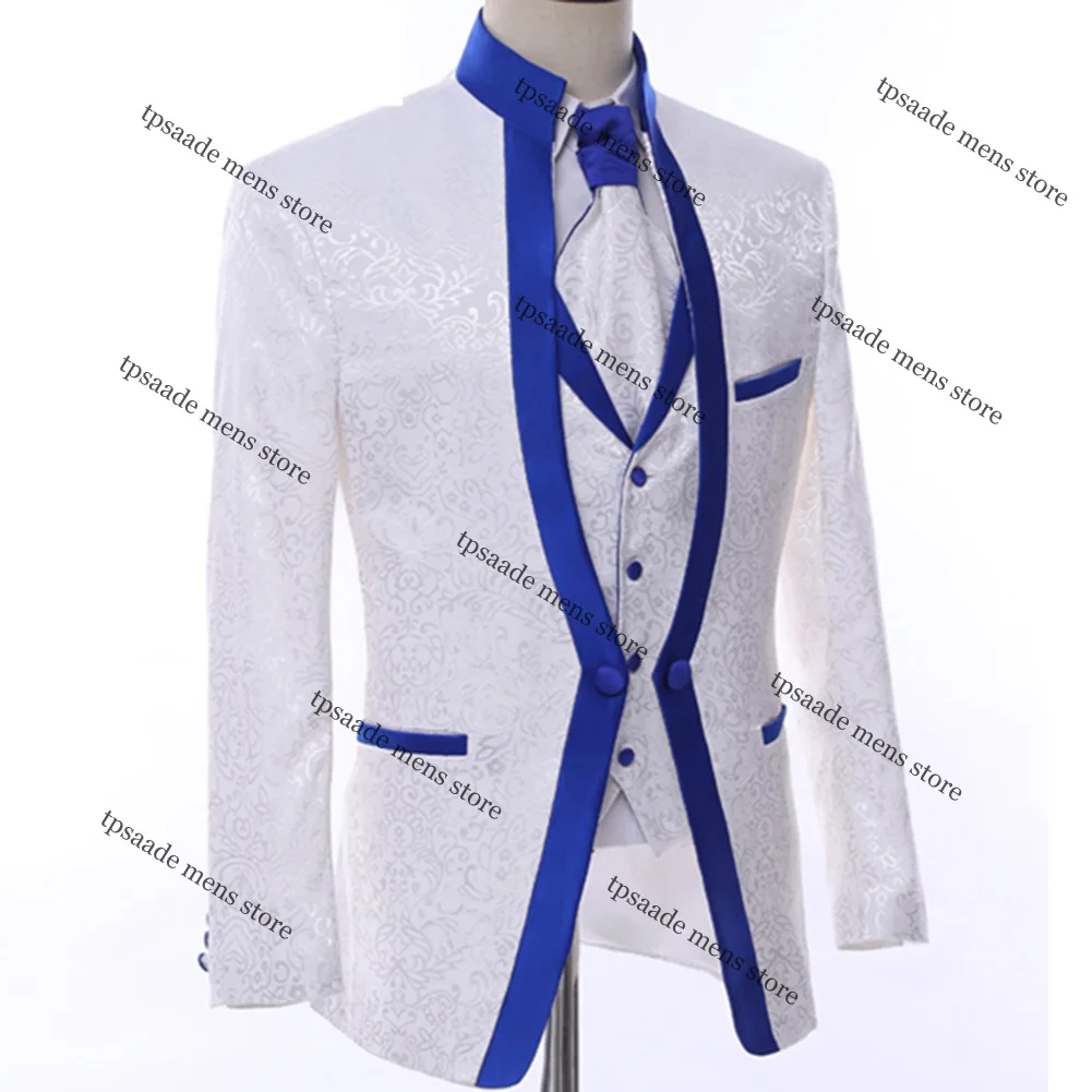 Комплект сценической одежды для мужчин, белый, Королевский синий цвет, свадебный костюм, смокинг для жениха (пиджак + брюки + жилет + галстук)