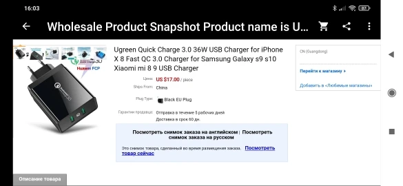 зарядник отличный , qc3.0 поддерживает, хуавей хонор быструю зарядку(9v) поддерживает, кроме суперчарж. до Челябинска 3 недели