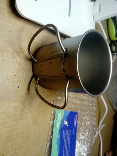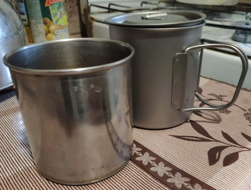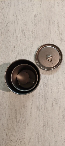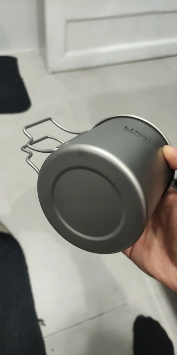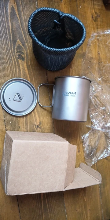 Великолепная кружка! Настоящий Ti - невесомый и прочный. Очень удобная крышка с треугольной ручкой, фиксирующийся в вырезе крепления. Бонус - качественный сетчатый чехол.