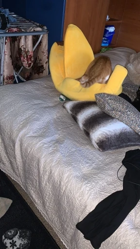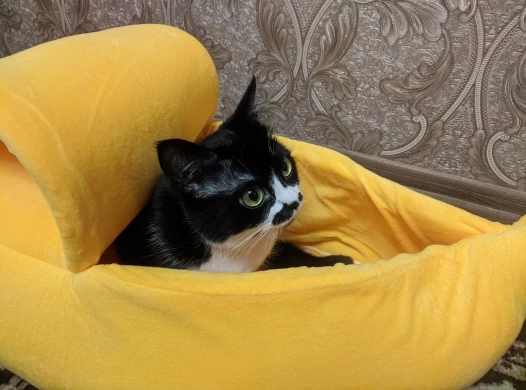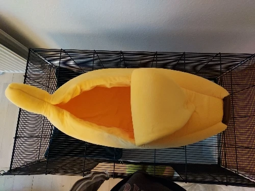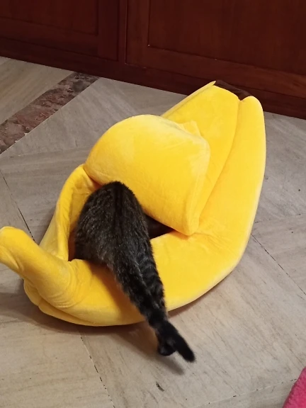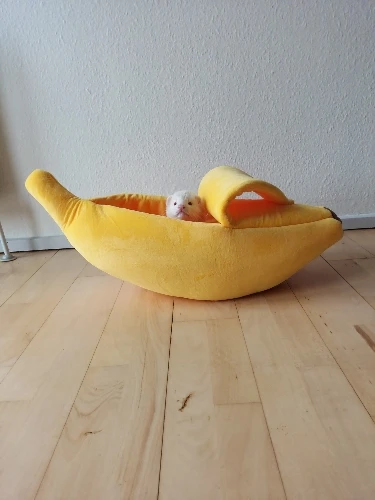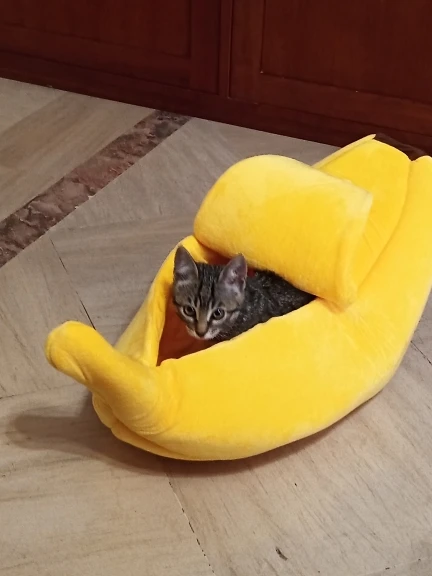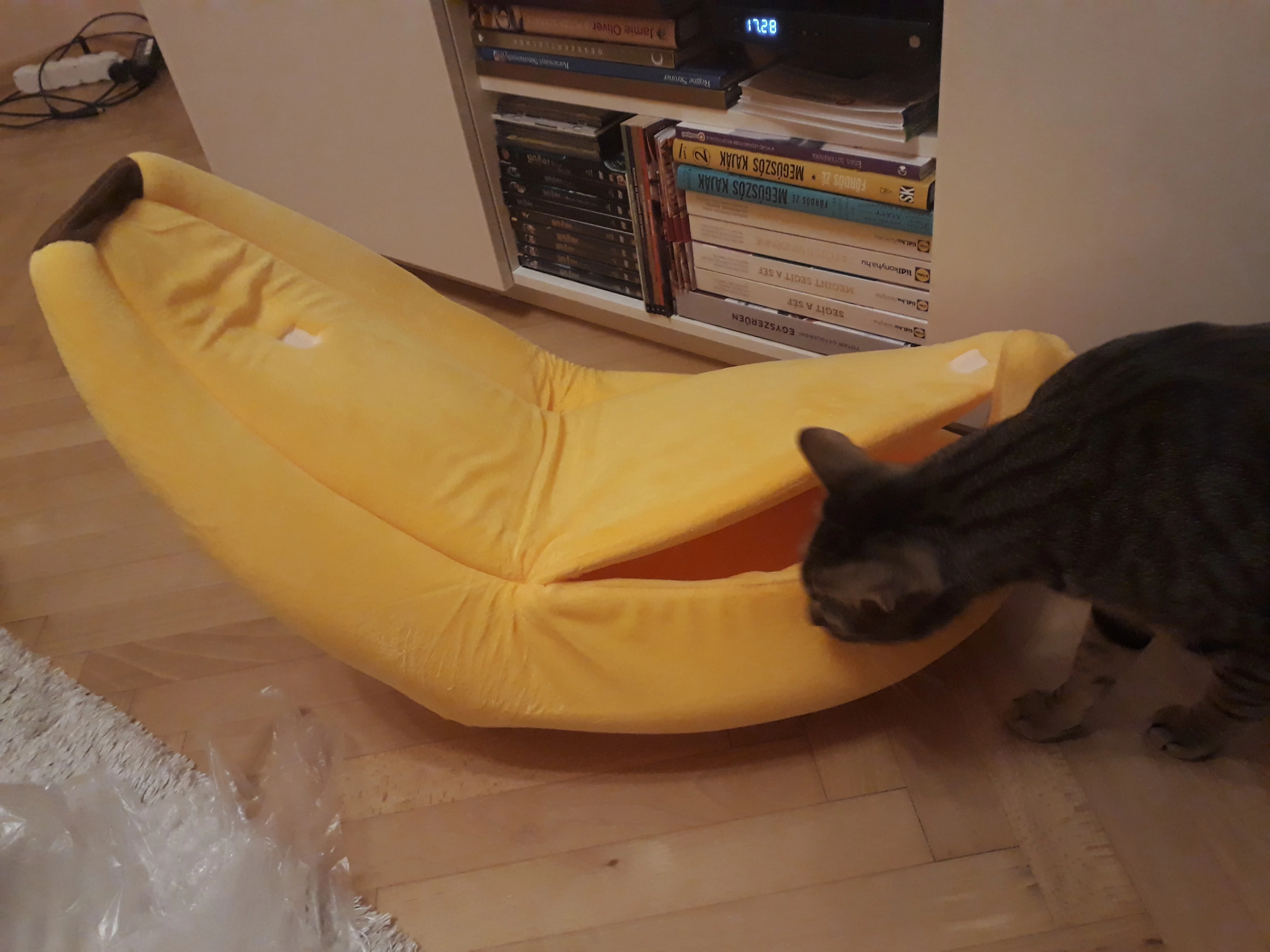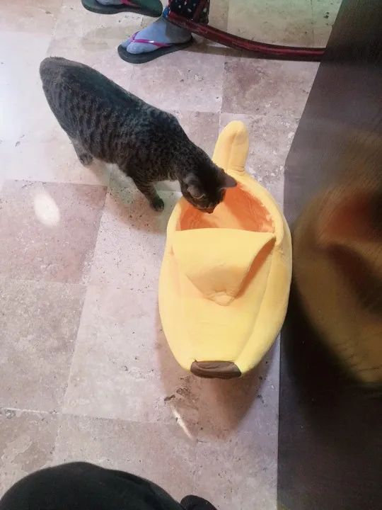 Товар прибыл всего за месяц. Кровать для домашних животных банан была сложена в мешке, чтобы сэкономить на пространстве и размере контейнера, так что она имеет несколько морщин, но она в значительной степени, как рекламируется. До сих пор кошка пользуется им