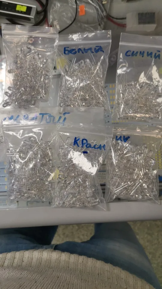 Заказывал 7 разных цвета, пришло 6 мешочков, при чем один на половину пустой. В одном мешке не могу определить какой цвет, так Как не зажигается, красный тоже не зажигается почему то... Просто моргнет и не горит и все, оранжевый, белый, синий горят на АКБ 3.7 18650, короче не стоит заказывать.