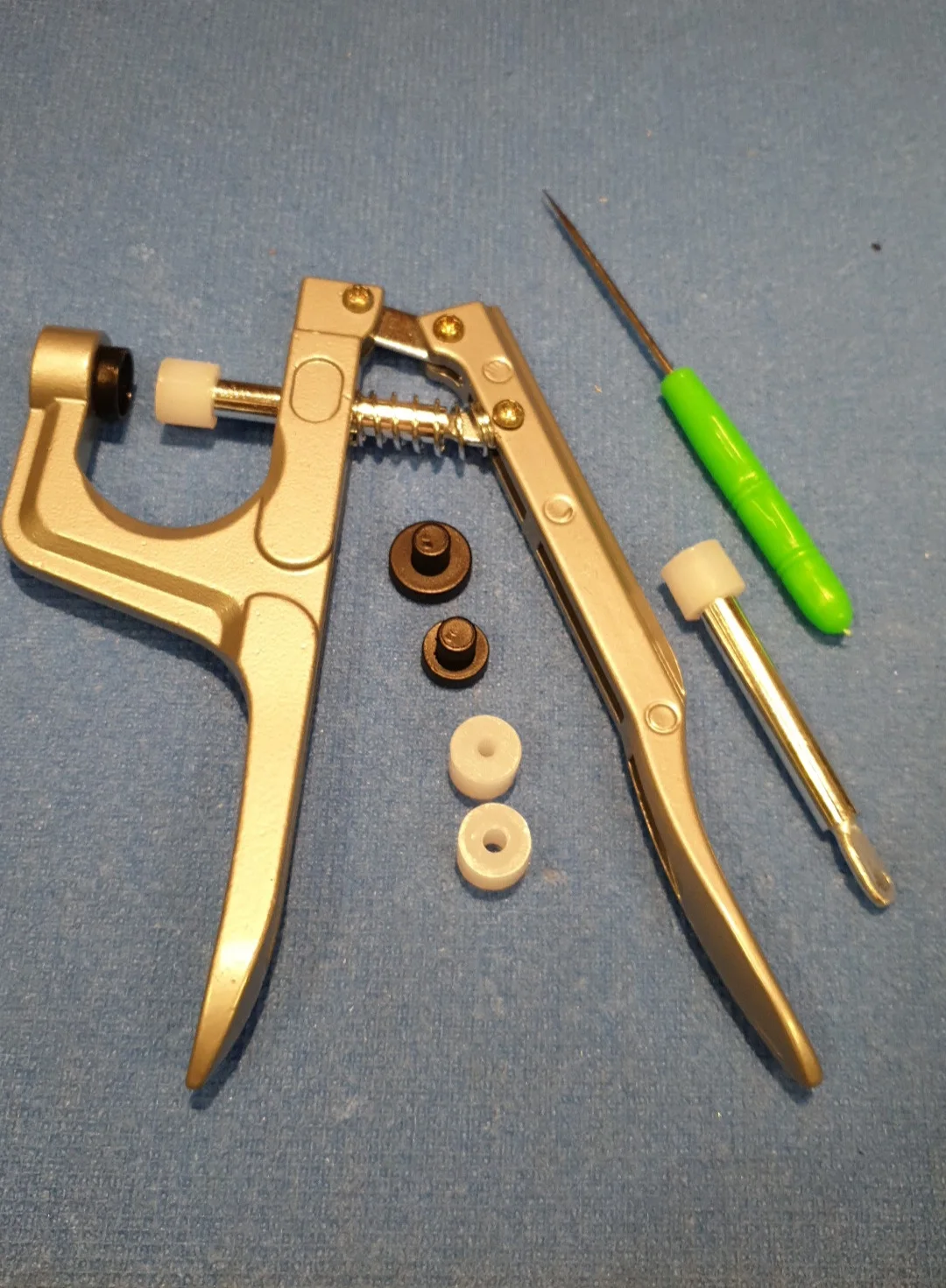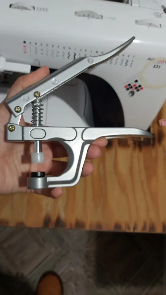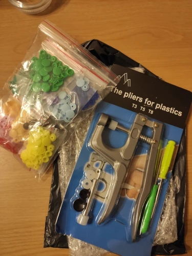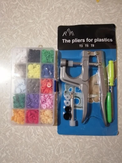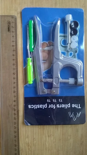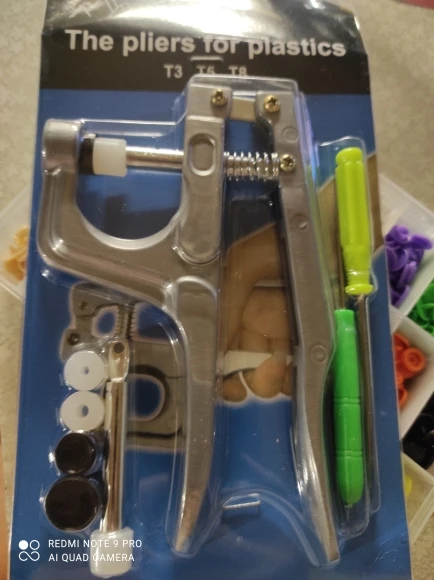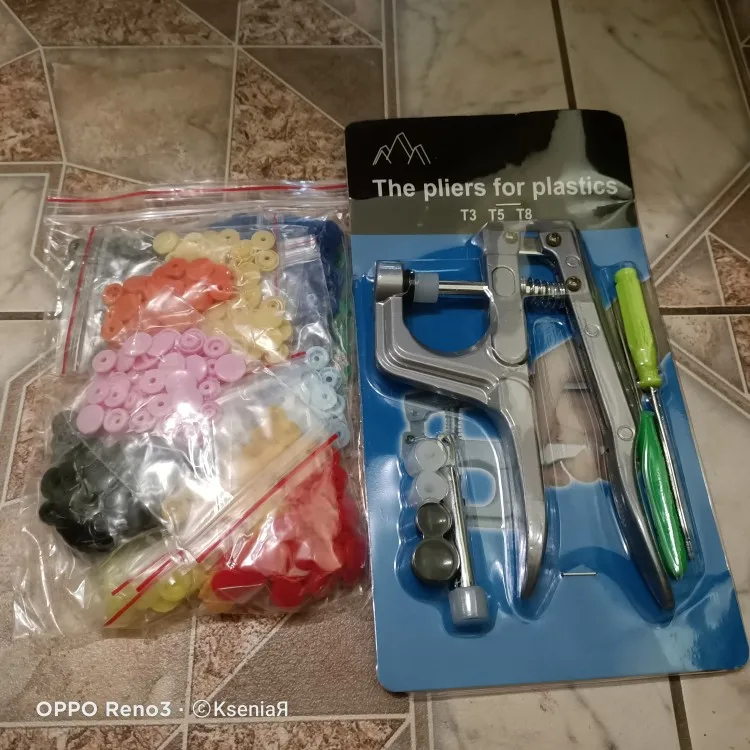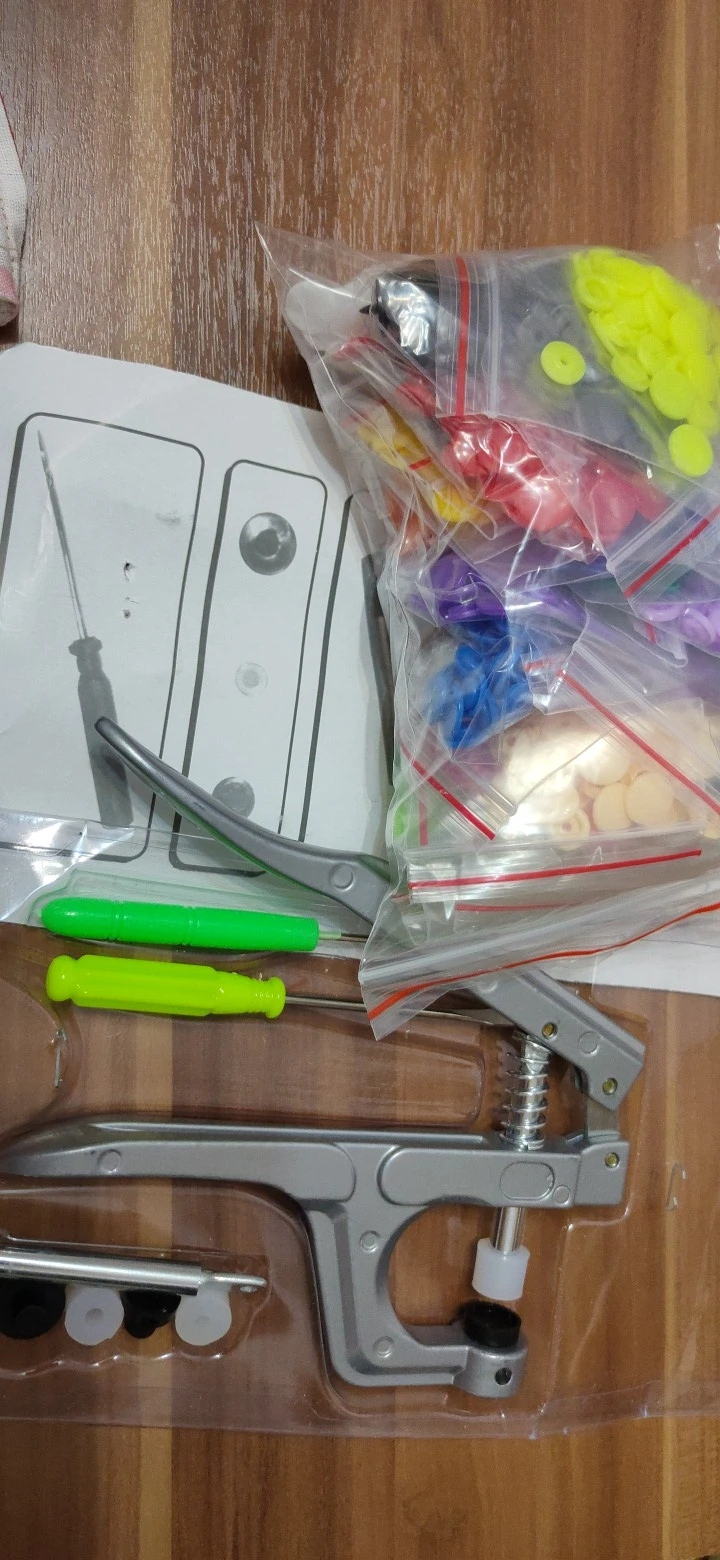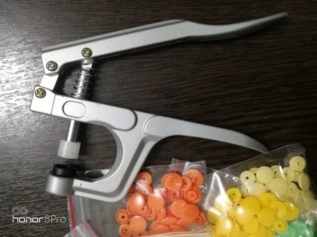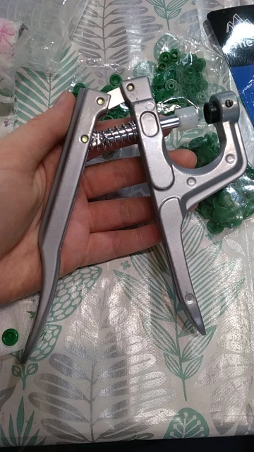 Покупал жене в подарок. Она очень довольна инструментом и его качеством. Кнопки делаются просто, зажимаются и держатся хорошо. Держат без проблем даже довольно толстые ткани (на фото показано, как пробовали несколько слоев зажать кнопкой). До Ярославля за 3 недели посылка пришла. Отслеживалась на протяжении всей доставки. Рекомендую и продавца и товар. Всё супер!