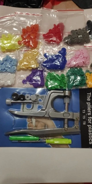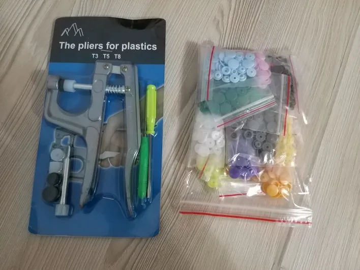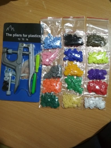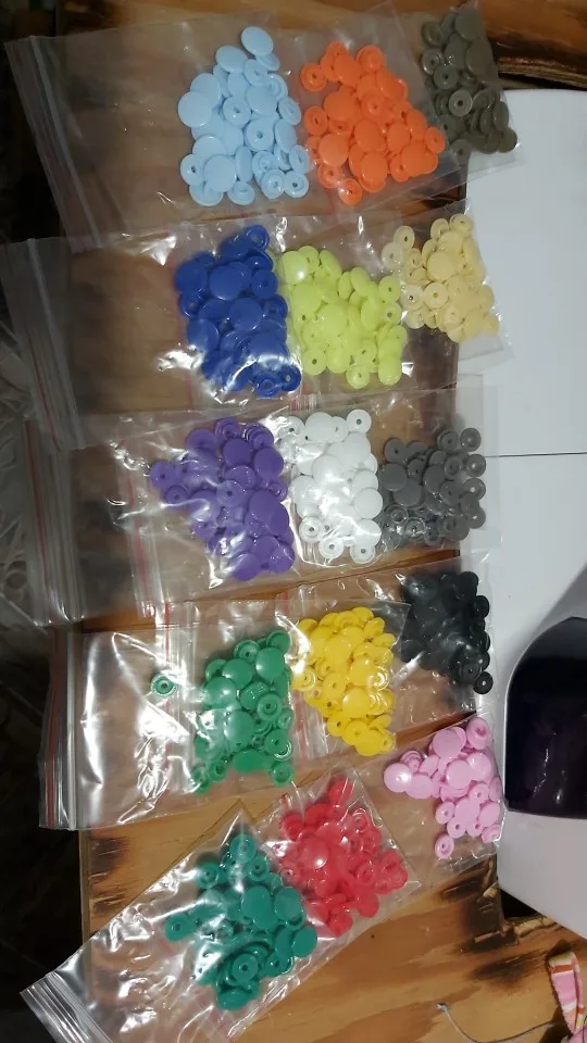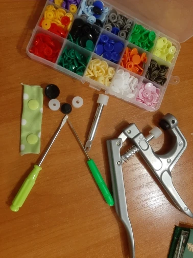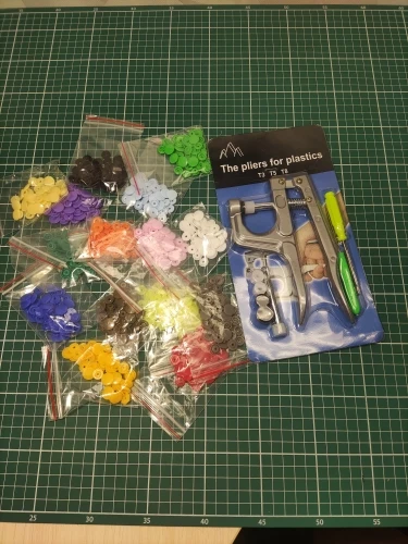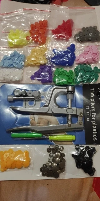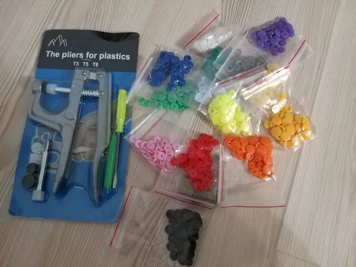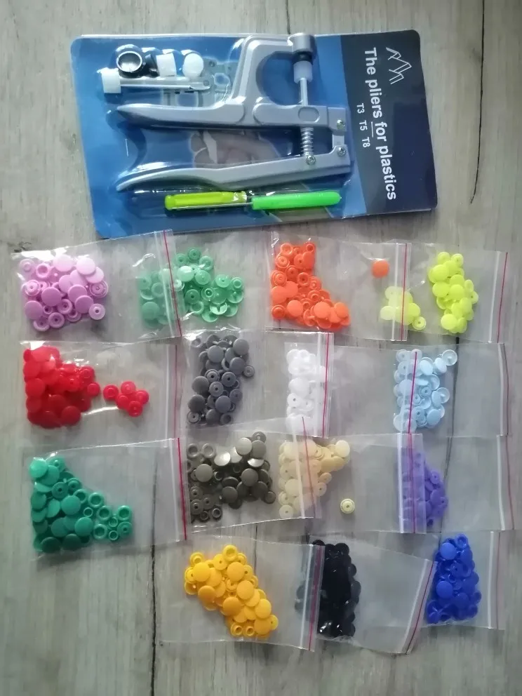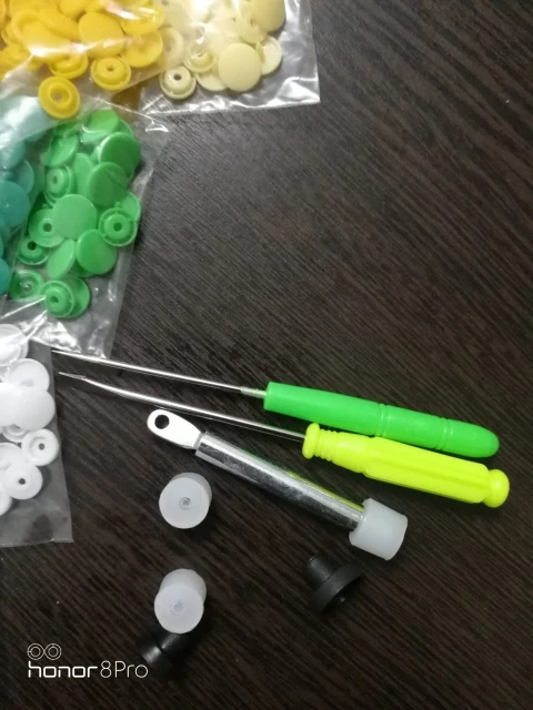 Заказ пришёл быстро, недели за 2. Кнопок каждого цвета примерно по 15 шт( считала некоторые цвета). заказывала для многоразовых подгузников. По качеству: слабее, чем те, что на хороших подгузниках типа Alva, кроме того, в некоторых элементах дырки больше, поэтому они неплотно садятся, но закрепить их можно и всё будет работать хорошо. У одного цвета кнопки были из непонятного пластика- трескались при зажиме. Но цена небольшая , поэтому нормально. инструмент нормальный. всё как в описании. заказом довольна. продавца советую. спасибо за заказ.