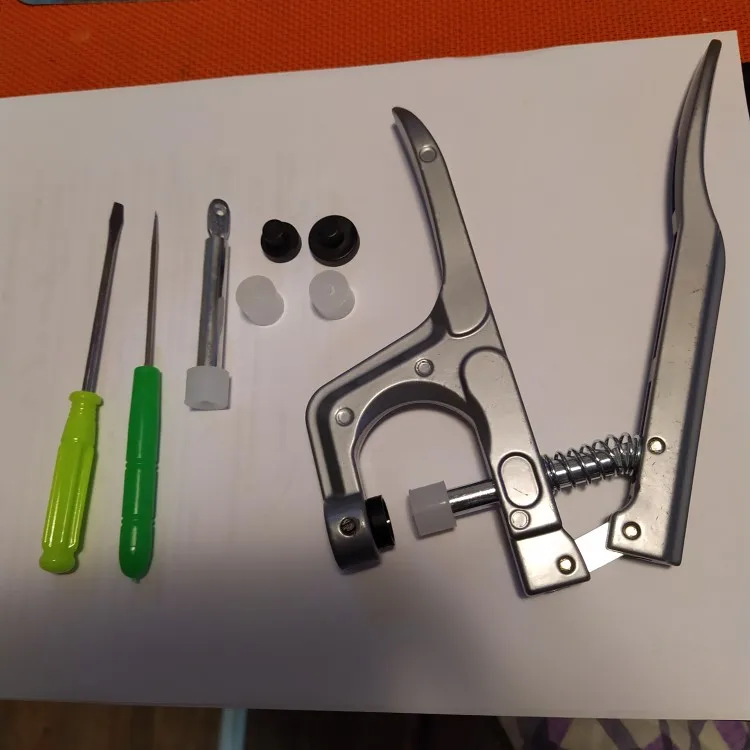 Качество хорошее и быстрая доставка. Фото не делала, все как в описании. Работает просто, делаешь шилом дырочку, вставляешь нужную кнопку с шляпкой и пистолетом расплющивается носик у шляпки.