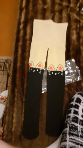 Классные колготки, дочке очень понравились! Спереди нарисована мордочка кота, а сзади хвост. По качеству плотные, хорошо тянутся. На рост 140 см подошёл размер L.