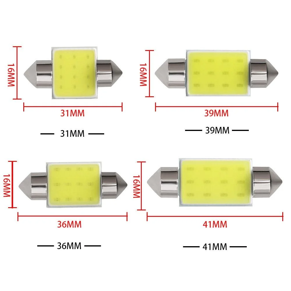 Совершенно новый и высокое качество.Низкое энергопотребление и сверхдлительный срок службыЛегко установить, просто заменить, удобно использоватьЗамена на обычный галогенный светильник, этот светодиодный/SMD светильник s ярче, чем на складеДля замены индикаторный светильник s, светильник для чтения s, светильник номерного знака s, дверной светильник s, боковой габаритный светильник, задний светильник, запасной светильник sХарактеристики:Напряжение: DC12VЛюмен: 100 лмКоличество СВЕТОДИОДНЫЙ: COB 12SMDСветильник Цвет: чистый белыйРазмер: 31 мм 36 мм 39 мм 42 мм