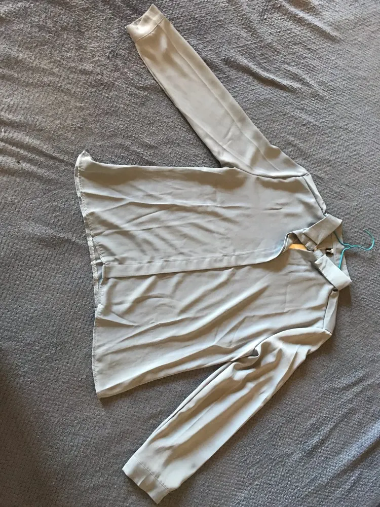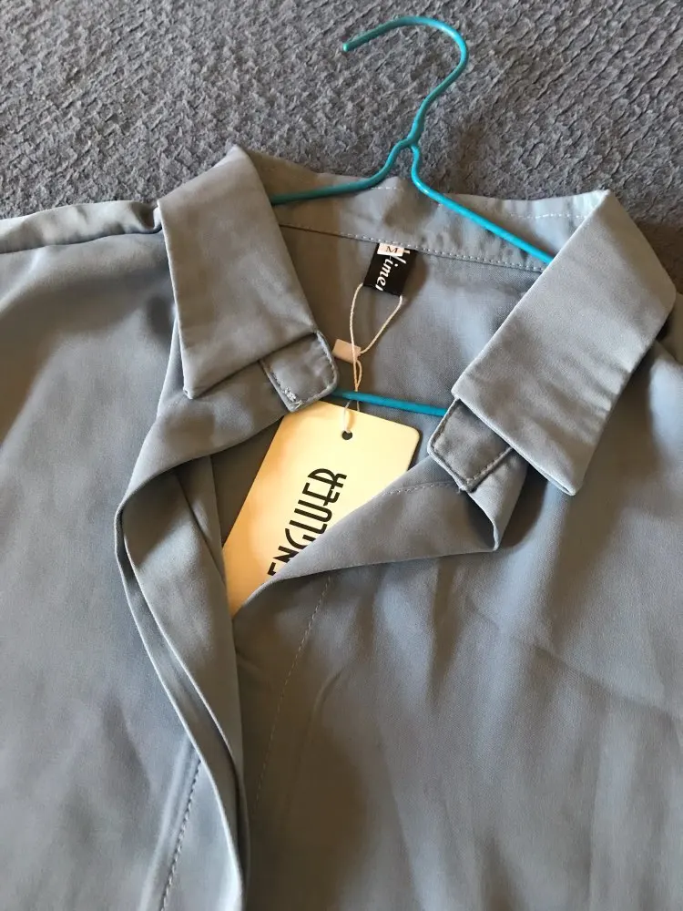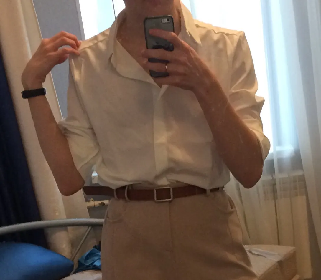 Думала будет на пуговицах, но нет сшита сплошником. Ткань приятна к телу, свет такой как на фото. Заказала на размер больше, думала будет маломерить. Все равно ношу на верх цепляю булавку)