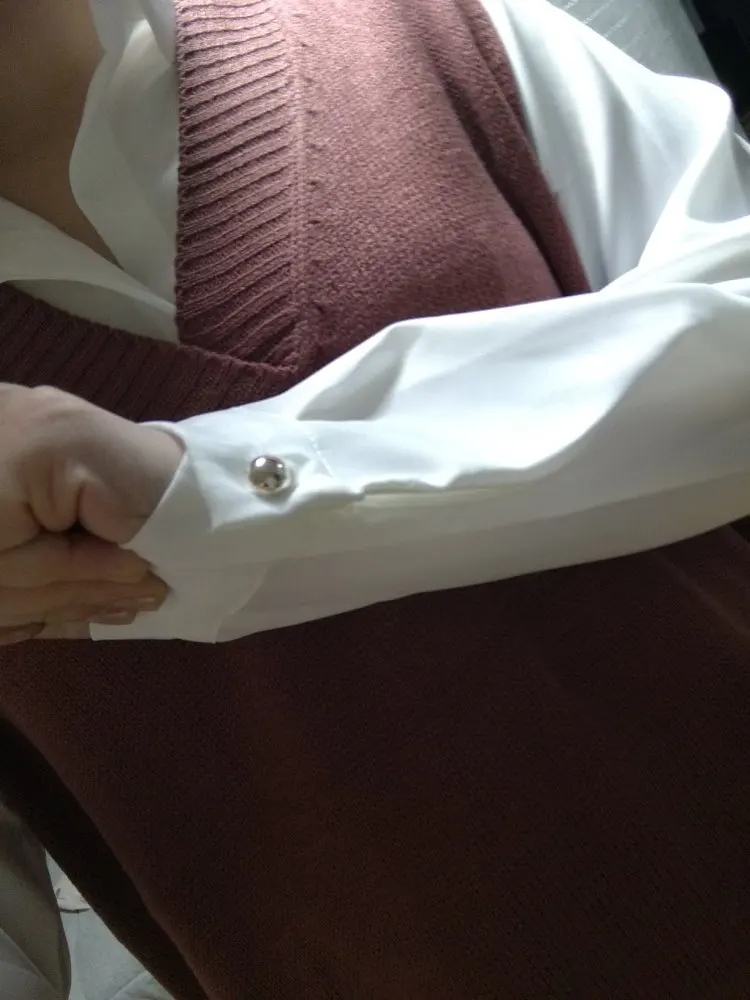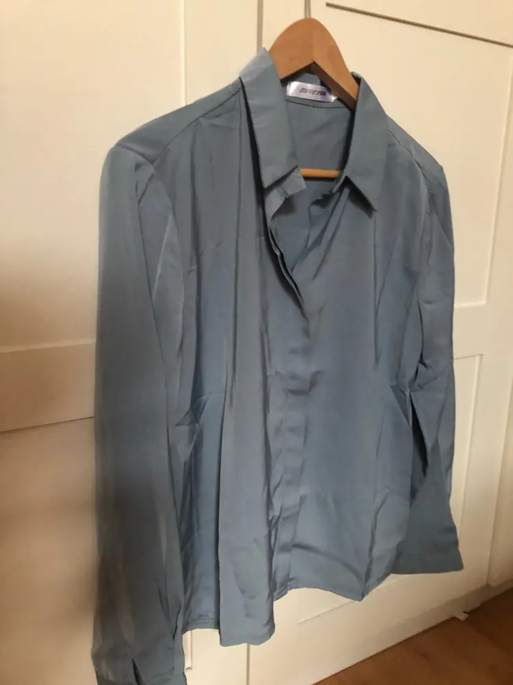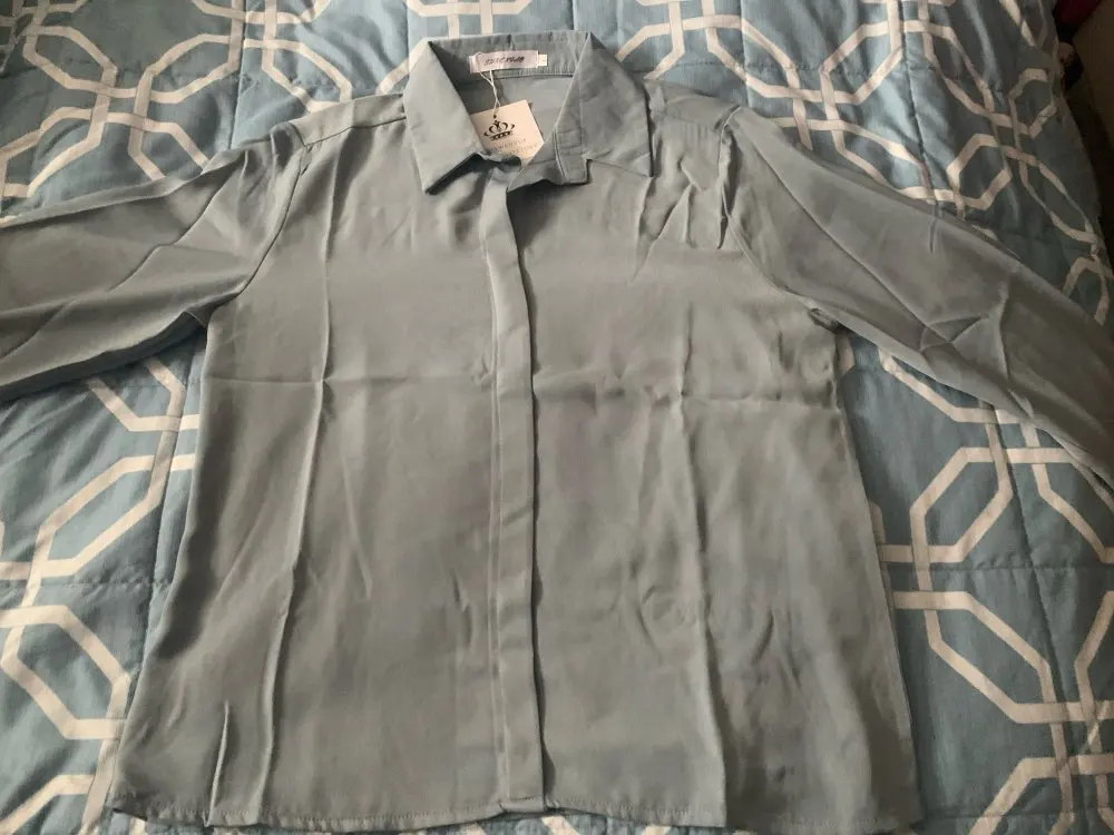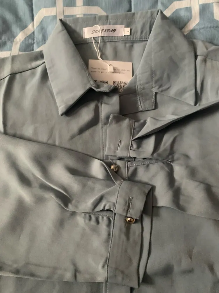 блуза хорошая, ткань мягкая, цвет в точности, как на фото. единственное, пуговицы на рукавах не очень хорошего качества. думаю потом заменить их, но, впринципе, можно просто подкатить рукава. трек-код отслеживался, посылка пришла намного раньше