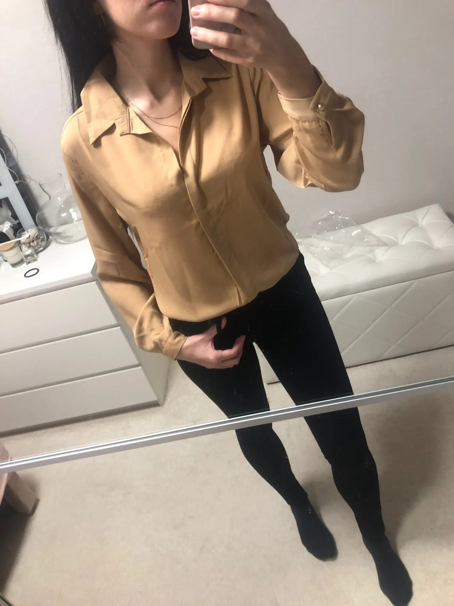 Отличные рубашки! Да, синтетика, но очень приятная к телу. Ткань тяжелая, гладится очень хорошо. Только с размерами опять напутали)) Белая рубашка размер L, а кэмэл размер M. Так вот белая меньше по размеру)) Но и тем не менее, обе рубашки подошли и сидят отлично! Спасибо продавцу за качественный товар!