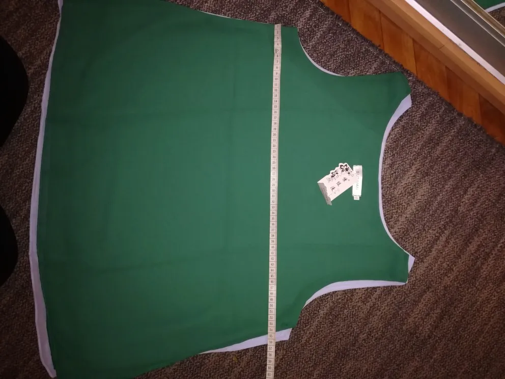 Имеет достаточно глубокий вырез сзади и в области подмышек. Из-за этого, лучше смотрится с пиджаком или длинной рубахой, которую можно не застегивать. Размер подбирался по формуле: обхват груди + 4 см. Подошло. Смотрится свободно по низу и, полотно сидит в плечах.