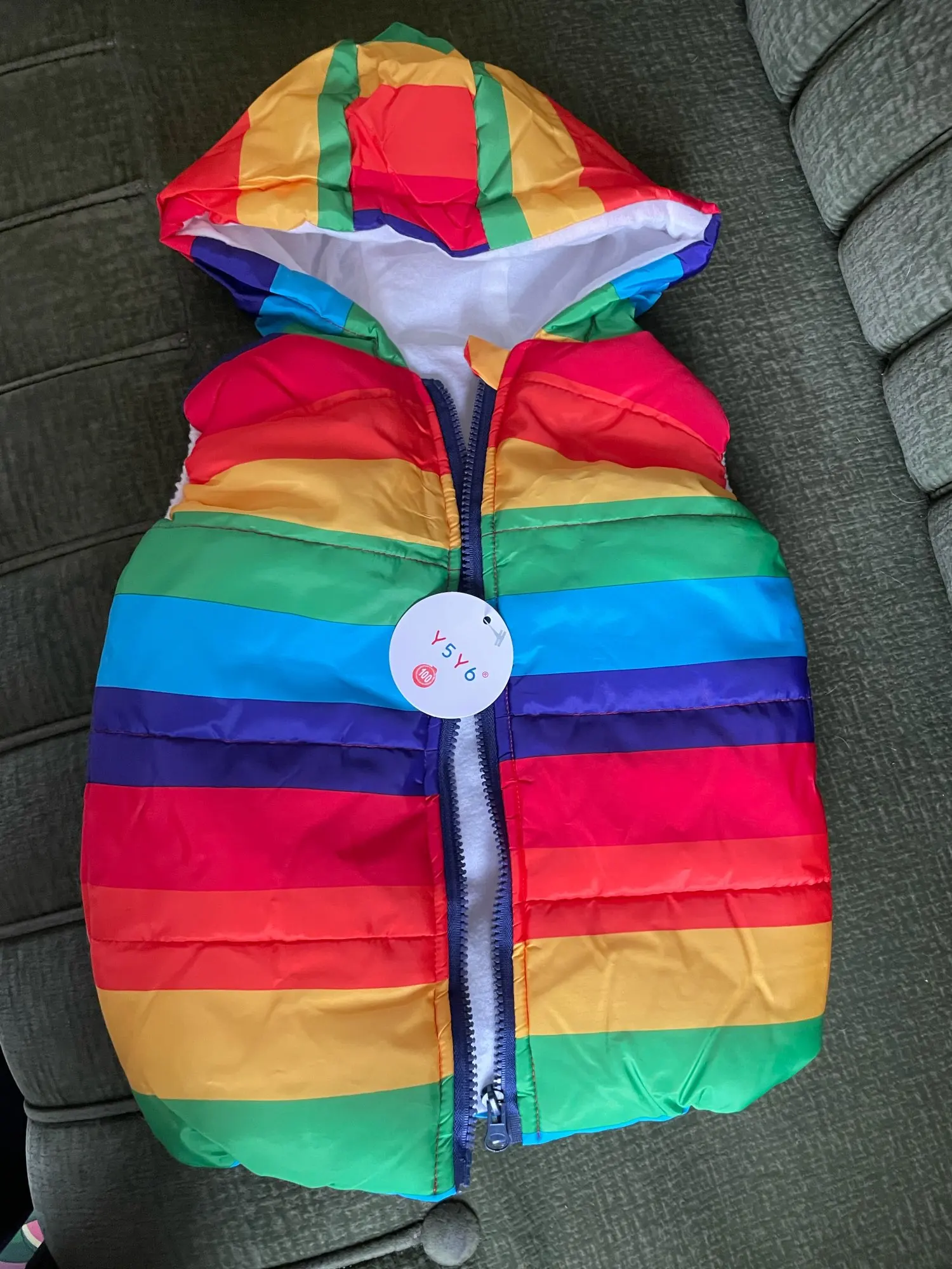 Жилет детский осенний, с капюшоном, в радужную полоску