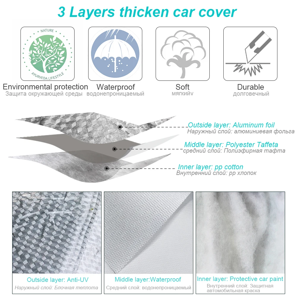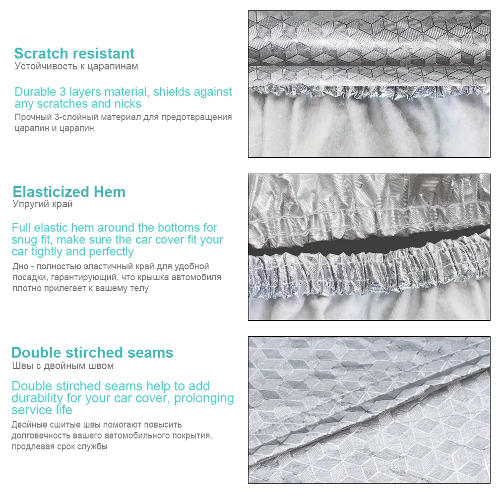 -Подходит для любых погодных условий, защищает ваш автомобиль от летних вредных ультрафиолетовых лучей, 1500 давление воды обеспечивает водонепроницаемость ткани, Зимний снег, лед, мороз и град, останавливает капельки птиц, листья, пыли и царапин, идеально подходит для использования в помещении и на открытом воздухе.