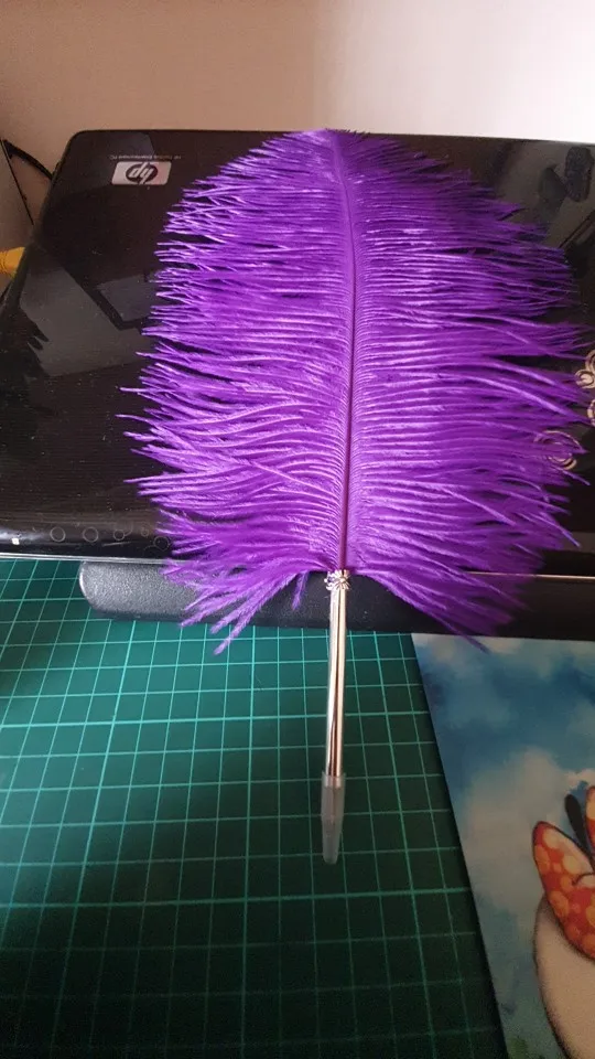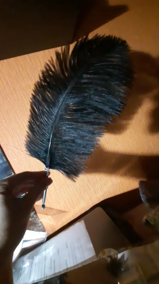 Шикарное перо! Выглядит просто бомбически! нереально!))) Короче восторг! Пишет черным. Тоненькое довольно, мне бы потолще, но пойдет. Красота перевешивает. не поняла зачем белый шарик в комплекте. Только не одевайте его на кончик иначе вырвет наконечник и чернила выльются (проверено). Доставка месяц в Новоросс. Гарри Поттер стайл чеееек))) Thanks!