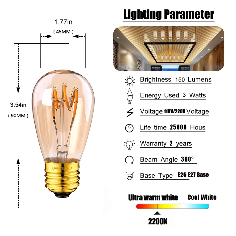Цветовая температура: Ультра Теплый Белый 2200KЦвет стекла:Янтарное стекло