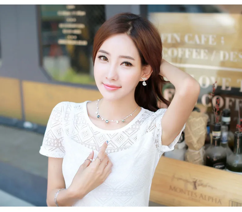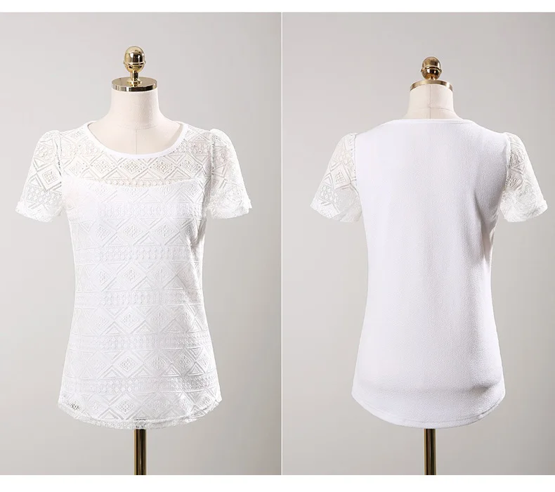 Летняя блузка женская белая кружевная с коротким рукавом размера плюс корейские вязанные крючком топы с круглым вырезом рубашки Camisas Femininas Qz *