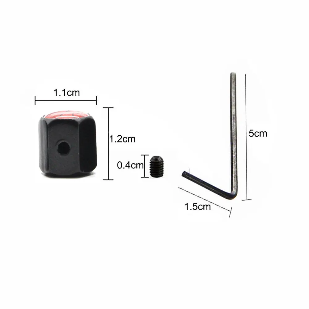 5. Пакет включает в себя: 5 шт./компл. (4 шт. колпачки, 1 гаечный ключ 4 анти-кражи винты); Размеры: 4,8*1,5 см/1,8*0,59 дюймов (мини); Вес: 26 г; Цвет: черный/серебристый (цинковый сплав)