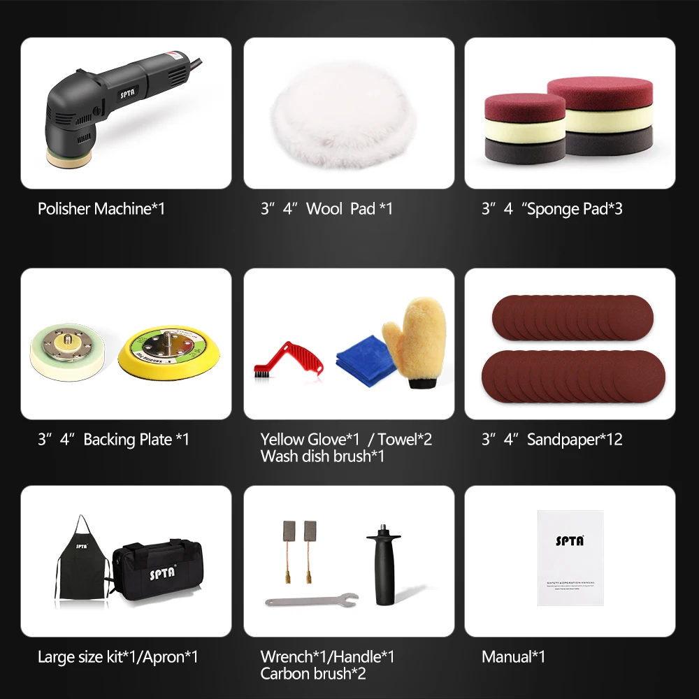 Комплект 1:Полировальная машина * 1, обработчик * руководство * 1, Угольная щетка * 2, гаечный ключ * 1, 3 "подложка * 1,4" подложка * 1,3 "губка * 3 и 4" губка * 3 ,3 "вата * 1, 4" вата * 1, полотенце для мытья автомобиля * 2, щетка для чистки дисков * 1, перчатки для мытья автомобиля * 1, наждачная бумага * 24, передник для мытья автомобиля * 1, рюкзак для инструментов * 1Комплект 2:Полировальная машина * 1, обработчик * руководство * 1, Угольная щетка * 2, гаечный ключ * 1, 3 "подложка * 1,4" подложка * 1,3 "губка * 3 и 4" губка * 3 ,3 "вата * 1, 4" вата * 1, полотенце для мытья автомобиля * 2, щетка для чистки дисков * 1, перчатки для мытья автомобиля * 1, наждачная бумага * 24, передник для мытья автомобиля * 1, рюкзак для инструментов * 1250 мл абразивы A & B * 1