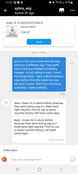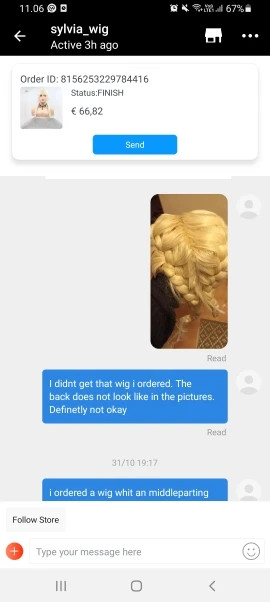 Заказал парик на фотографиях. Они прислали мне парик, показывающий на спине. Я задал вопрос о возврате, они не дали его мне. Сказал мне, что я должен ждать, потому что у них нет парика. Так что они только что отправили неправильный oneon специально! С радостью я получил большую часть своих денег назад, бросив Aliepress. Больше никогда здесь не заказывайте.