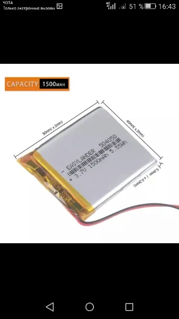 Заказал 12.04 продавец отправил 15.04 получил в службе доставки «СДЕК» 25.05 так как аккумулятор источник повышенной опасности поэтому везли долго.Покупал для навигатора «NAVITEL» с завода установлен аккумулятор 504051 напряжением 3,7 вольт и ёмкостью 950 mA припаял 504050 напряжение 3,7 вольт ёмкость 1500 mA в посадочное место сел как родной,аккумулятор был заряжен на 54% погонял навигатор по полной программе аккумулятор своё отрабатывает посмотрим как будет вести себя дальше отпишусь в дополнительном отзыве.