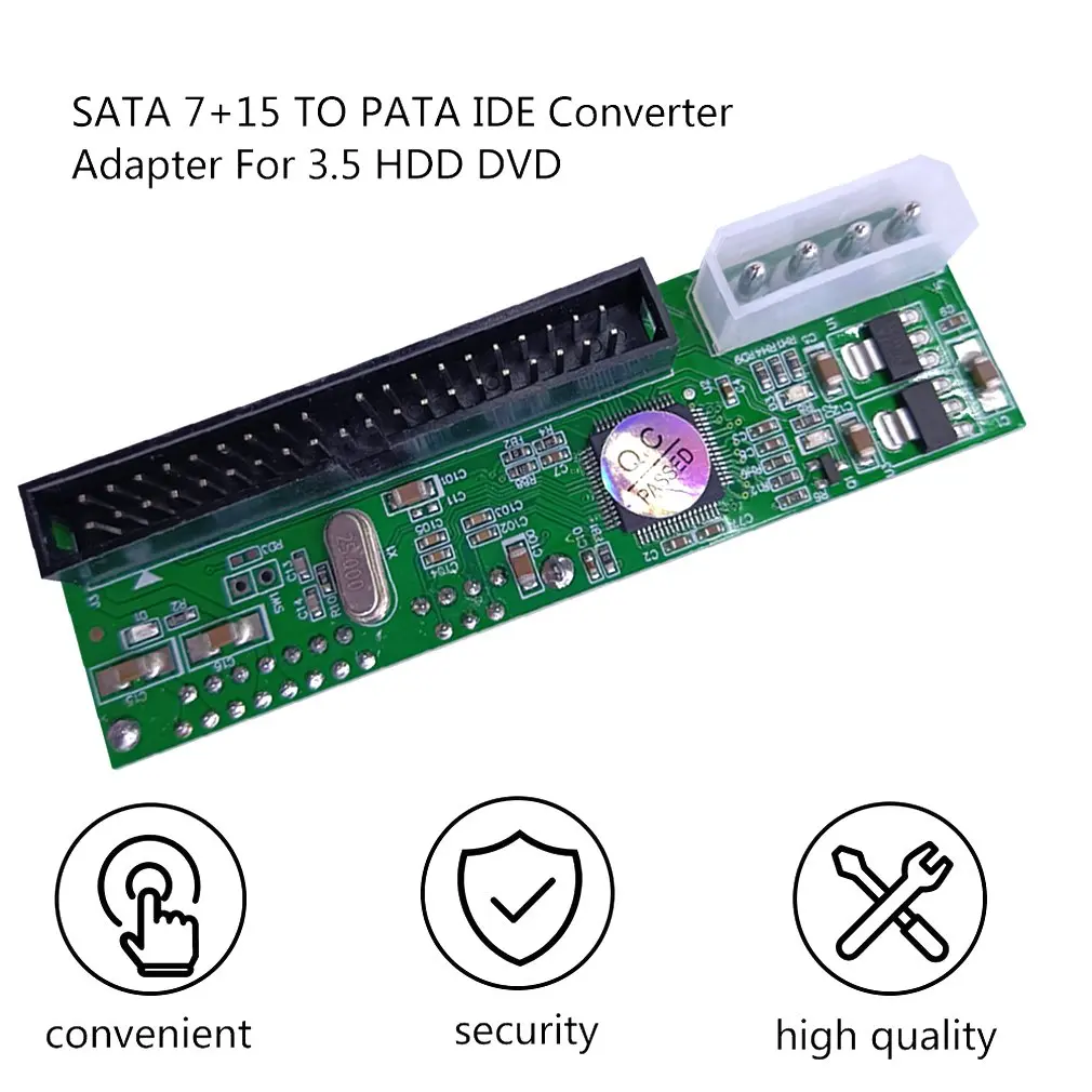 Особенности:SATA 7 + 15 В PATA IDE конвертер адаптер для 3,5 HDD DVDВысококачественный продукт, абсолютно новый.SATA 7 + 15 В PATA конвертер адаптеров IDE.Преобразуйте порт SATA/7 + 15 в порт IDE PATA.Подключи и работай, не требуется привод.Подходит для 3,5/2,5 SATA HDD DVD.Подходит для всех устройств SATA типа, таких как CD-ROM/CD-RW/DVD/DVD-RAM/HDD.Один 40 pin IDE порт для подключения порта SATA материнской платыОдин последовательный порт ATA для подключения порта SATA жесткого дискаОдин 4-контактный разъем питанияПоддержка ATA 100/133.Соответствует спецификации Serial ATA.Описание:Состояние продукции: на складеТип: Кабели SATAПосылка: нетТехнические характеристики:Цвет: зеленыйРазмер изделия: 98*26*22 ммПосылка в комплекте:1 х SATA 7 + 15 В PATA конвертер адаптеров IDE