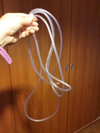 Обычный шланг, прозрачный, гнется легче, чем, например, от Трикси, который можно купить, в наших магазинах, т.е. толщина стенки меньше или материал мягче (скорее второе, потому что толщина достаточная). Но не заламывается и не пережимается полностью, если, конечно, не изгибать его на 160-180 градусов в одном месте. Изгиб в 90-120 градусов переносит хорошо, просвет визуально не уменьшается. Хорошо надевается на стандартные распылители и переходники. В присоски-фиксаторы вставляется без проблем, но в присоске-фиксаторе с жестким держателем просвет немного изменяется из-за мягкости материала, но не уменьшается (просто немного выпячивается), хотя проверил и более жесткие шланги от Трикси – там то же самое.