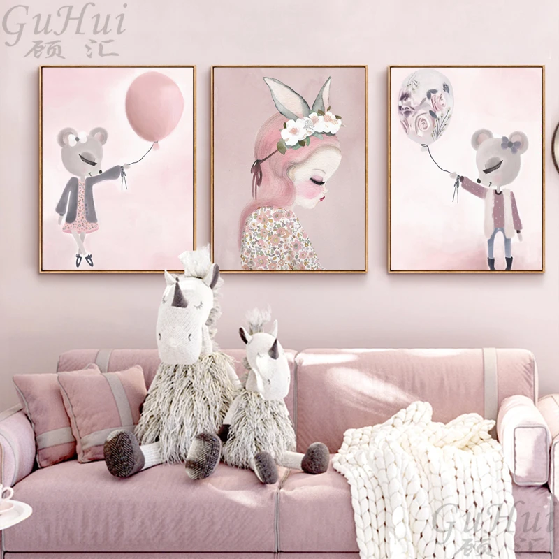 Постер в скандинавском стиле, с изображением розового мультяшного цветка, девушки, кролика, эльфа, единорога, лебедя, Картина на холсте, Настенная картина, декор для детской комнаты