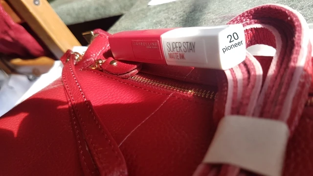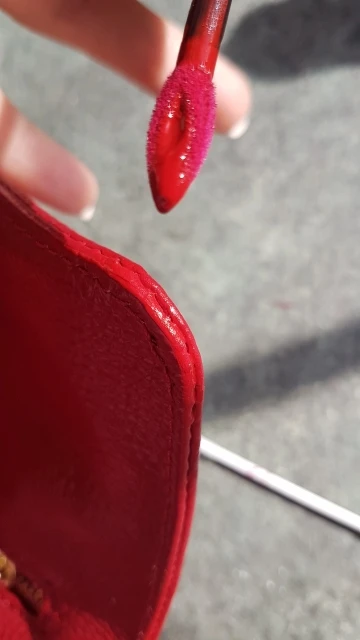 по углам не красиво виднелись белые прорубы иглы от изнанки-Компазиционной кожи,я замаскировала из устойчивой помадой от Maybelline (20 Pioneer)-именно такого цвета эта сумочка vine red.Кто там спорит кожа это или нет,Да кожа,но только измельчённая в труху и вновь спресованная,так сейчас всё делают,хотите пузико от лайки готовьте кругленькую сумму.