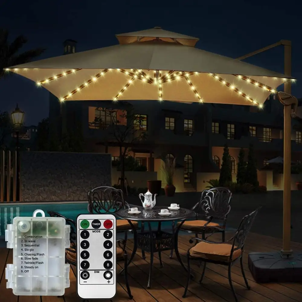 Светодиодный зонтик для патиоПодходит для всех наружных патио зонтов с 8 ребрами.8 режимов освещения для различных случаев, включая комбинацию, волну, последовательное, медленное свечение, вспышку, медленное выцветание, мерцание и устойчивость.Яркость: 10 уровней Яркость регулировкиВремя: 2/4/6/8 часовРежим цикла: Включение 6 часов в день, выключение 18 часов, автоматический цикл