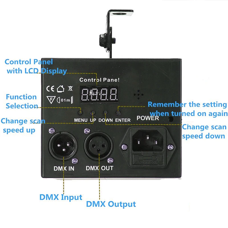 1. Режим управления: Голосовое управление; Звук активный; Авто звук/DMX512; Мастер-раб. Светильник управления звуком зависит от того, какой ритм или Какая музыка воспроизводится, светильник мерцает и изменяет рисунки с ритмом музыки. Цвета также можно контролировать с помощью пульта ДУ до определенного цвета.