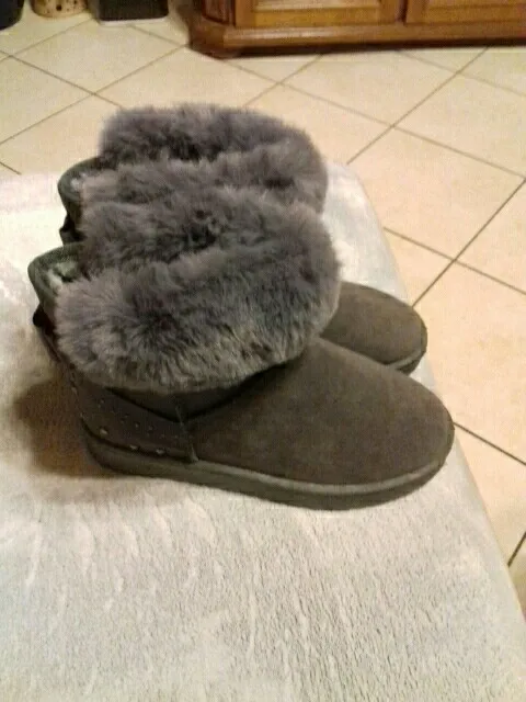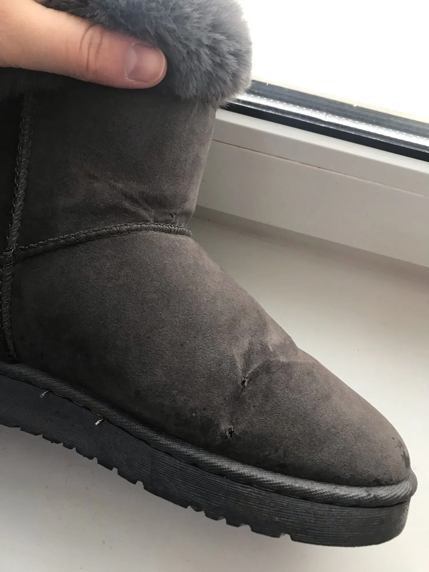 Угги классные! Пошиты качественно, верх искусственная замша, все швы качественные, опушка на ощупь как натуральный мех, мягонькая. Только у кого широкая лодыжка, могут возникнуть затруднения при одевании. На мой 36 размер заказала 7, по ступне подошли. Если кому надо с носком, берите на размер больше. Продавцу благодарность за качественный товар. Рекомендую продавца и магазин. 5+++++