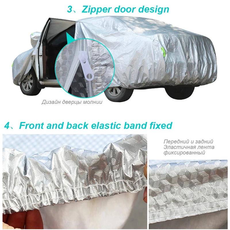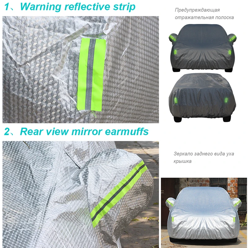 -Многофункциональный дизайн, молния двери водителя для легкого доступа, ветрозащитная Веревка на колесах спереди и сзади для защиты вашего автомобильного чехла не сдувается сильным ветром Предупреждение светоотражающие полосы согревают людей в ночи, большие наушники для большинства зеркал заднего вида автомобиля, блокировка паролем для предотвращения кражи.