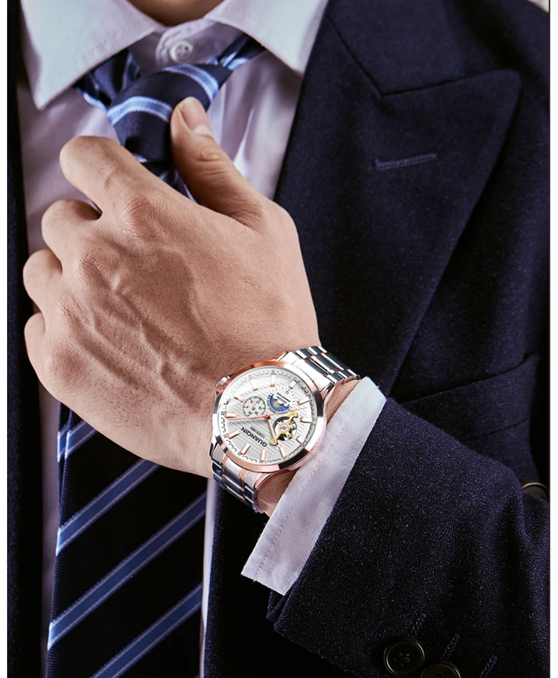 1. Все мини-циферблаты часов работают исправно.2. Чтобы обеспечить нормальную работу часов, перед первым использованием заведите их на 30 полных оборотов по часовой стрелке.3. Если вы носите часы менее 8 часов или если ваша рука раскачивается меньше чем необходимо, завода будет не достаточно для продолжения работы часов.4. Отображение дня недели: работа зависит от механического автоподзавода. Значение на циферблате дней недели обновляется в 3 или 4 утра на следующий день. Чтобы настроить циферблат дней недели, следует нажать дважды. (Проверка проводится вручную, у фактического изделия допустима разумная погрешность).-1. Оригинальное изделие; 2. Гарантийная карта; 3. Руководство пользователя; 4. Оригинальная коробка; 5. Ткань для зеркал; 6. Инструмент (штифт)