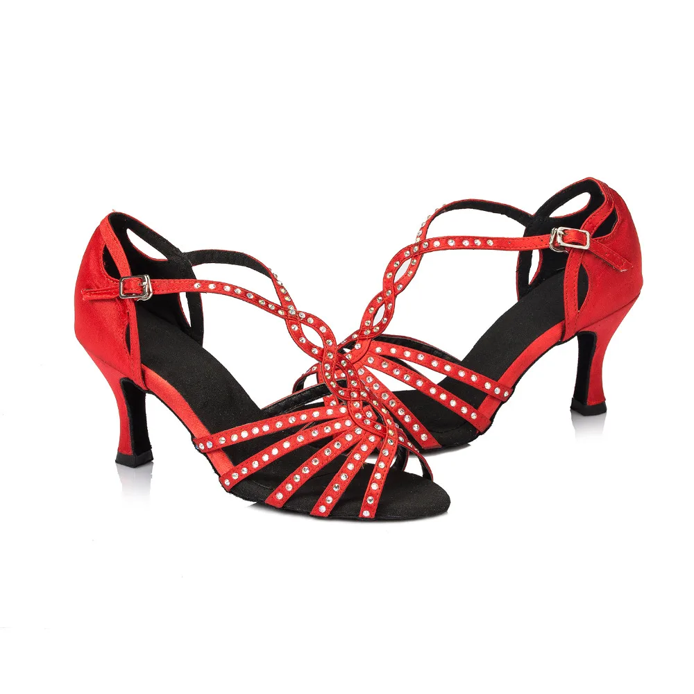 Туфли для латиноамериканских танцев со стразами; Туфли для вальса и Танго; Женская обувь на высоком каблуке; Sapatos de danca latina; Цвет черный, бронзовый, красный