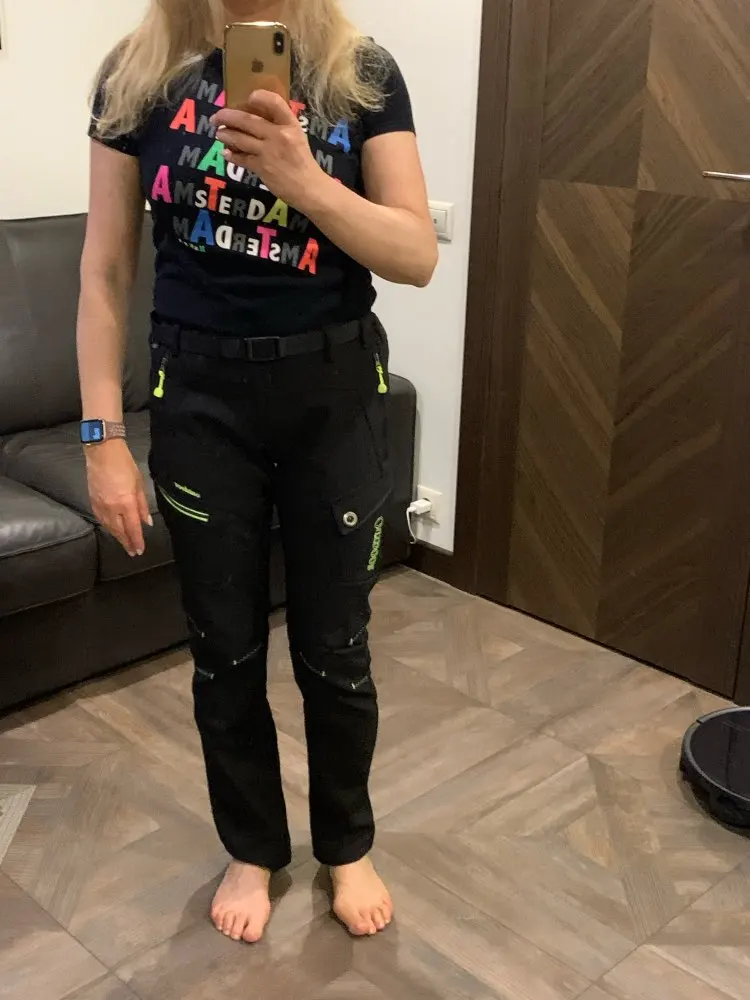 Низкая талия, брюки совсем не для активных занятий на улице, все поясница открыта. Ещё и для плоской попы сшито и материал совсем неэластичный. Поэтому сидят неудобно. Красивые, но носить невозможно.