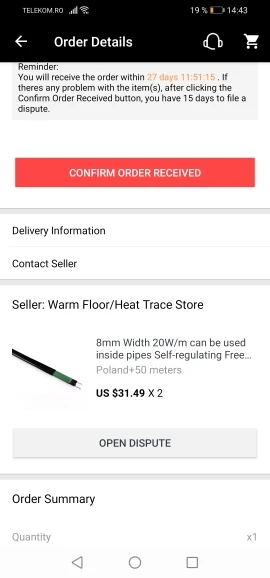 Очень быстрая доставка. Длина кабеля по метражу полностью совпадает. Температуру не замерял, но он греет. Планирую использовать его как подогрев окон на балконе, чтобы не запотевали. Укладка будет сделана в алюминиевую трубу - сейчас мастер конструкцию. Посмотрим, насколько кабеля хватит. Пока что все хорошо.