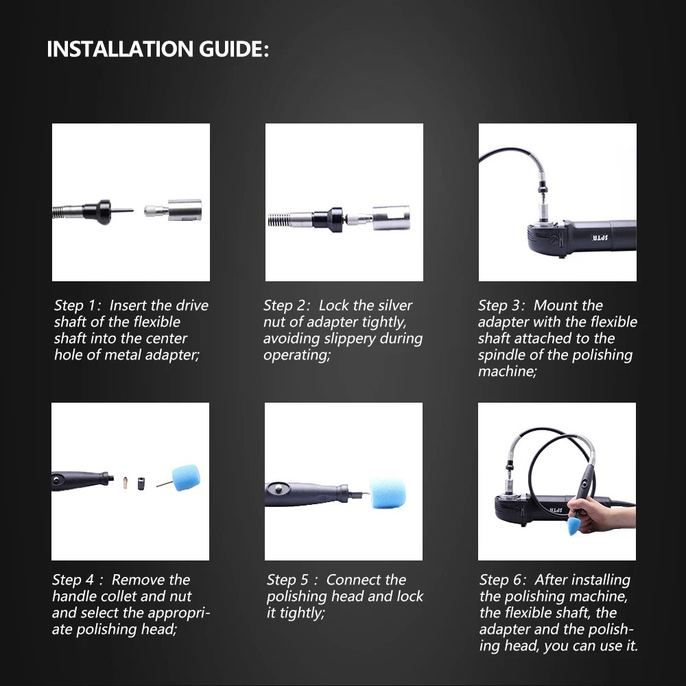 Шаг 4После установки полировальной машины, гибкого вала, адаптера и полировальной головки, вы можете использовать его.