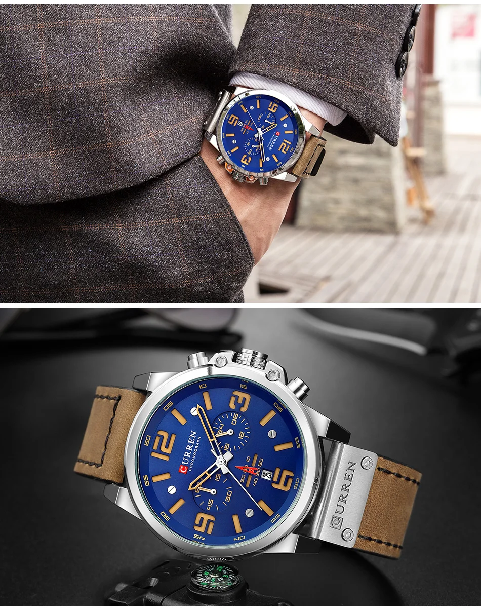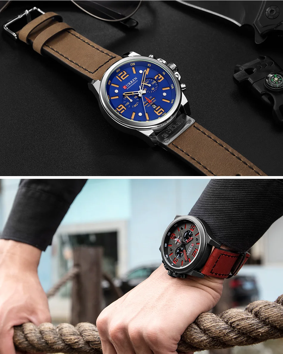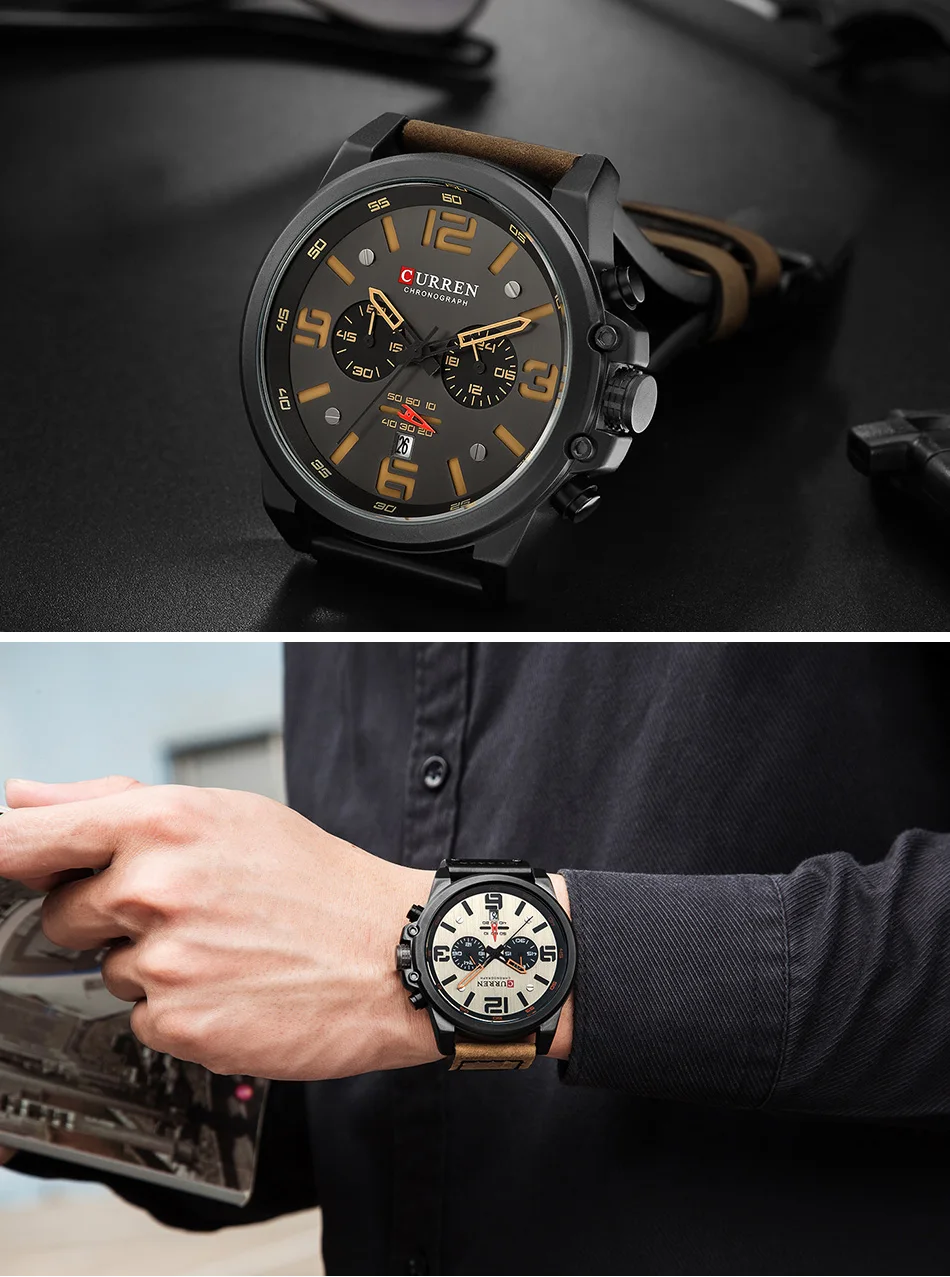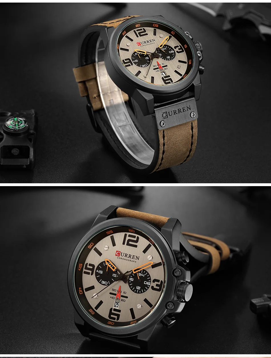 Часы CURREN Мужские кварцевые, модные повседневные спортивные водонепроницаемые в стиле милитари, с кожаным ремешком, с датой