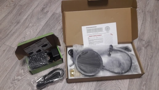 Коробка пришла не мятая, очень быстро. Все в комплекте, смотрится очень достойно. Про сам микрофон не скажу, ибо не скоро проверю.