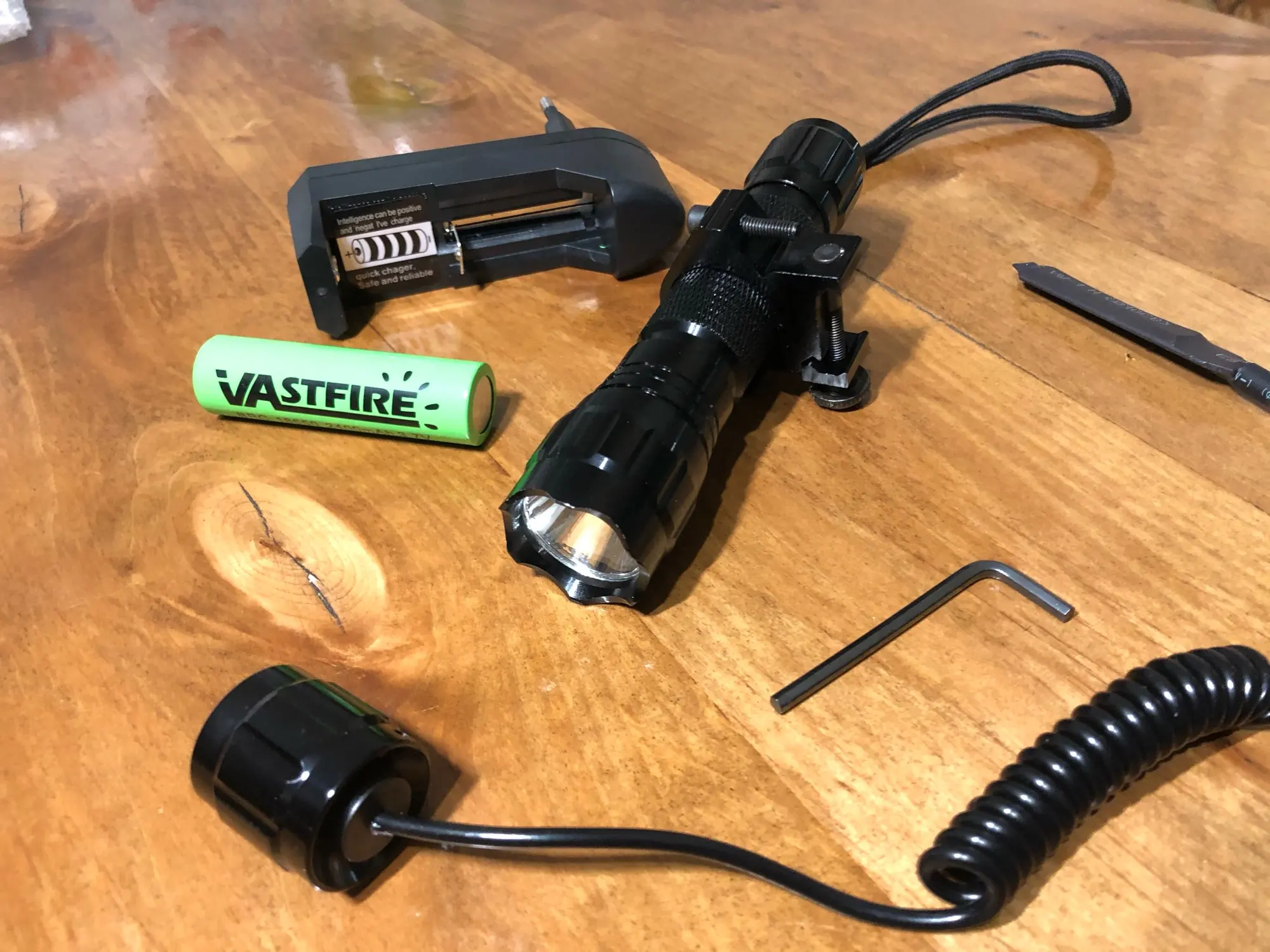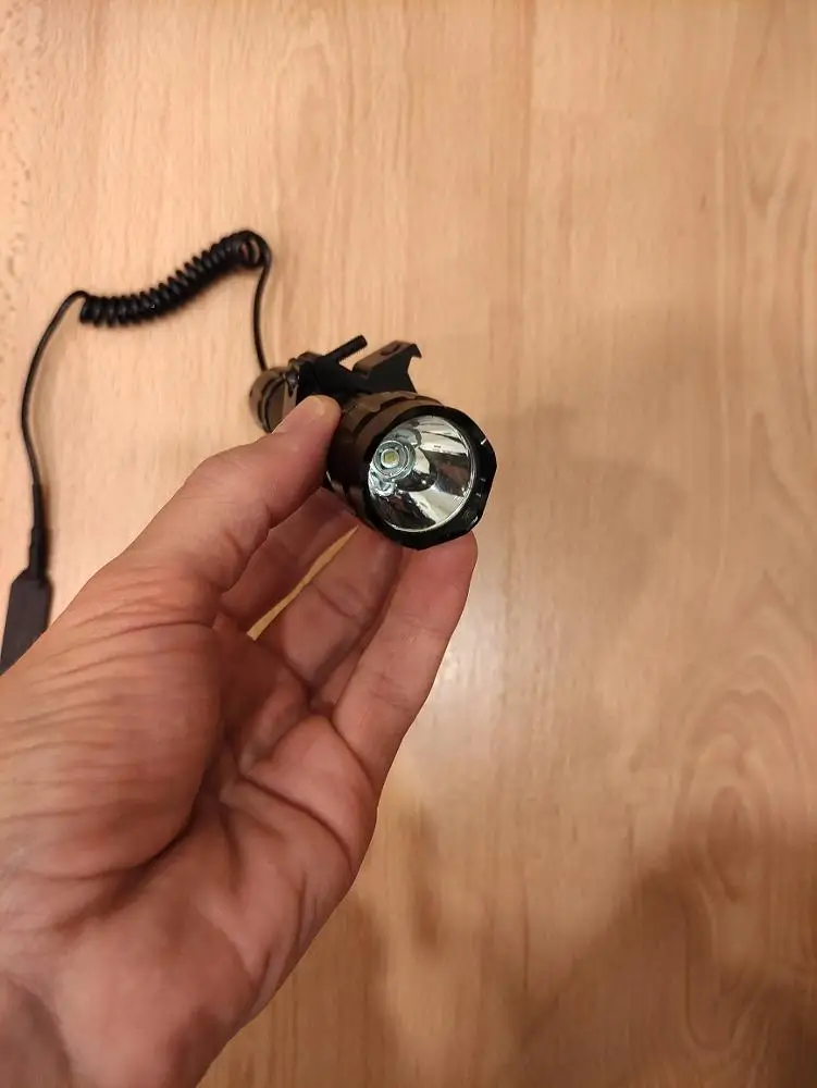 Очень яркий свет! Отличный фонарик, особенно по цене. Крепление на Пикатинни не очень хорошее, я бы хотел иметь более широкое крепление, чтобы он более надежно удерживал фонарик. Но за цену с аккумулятором 18650 и зарядным устройством в комплект не входит.