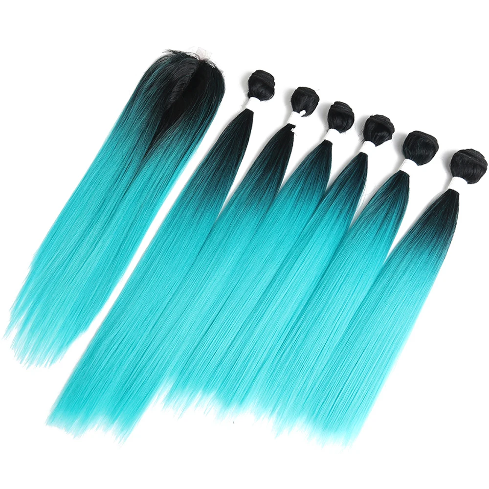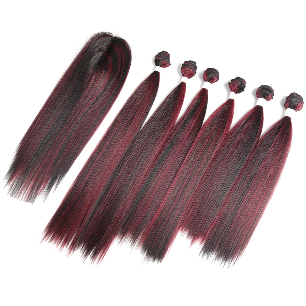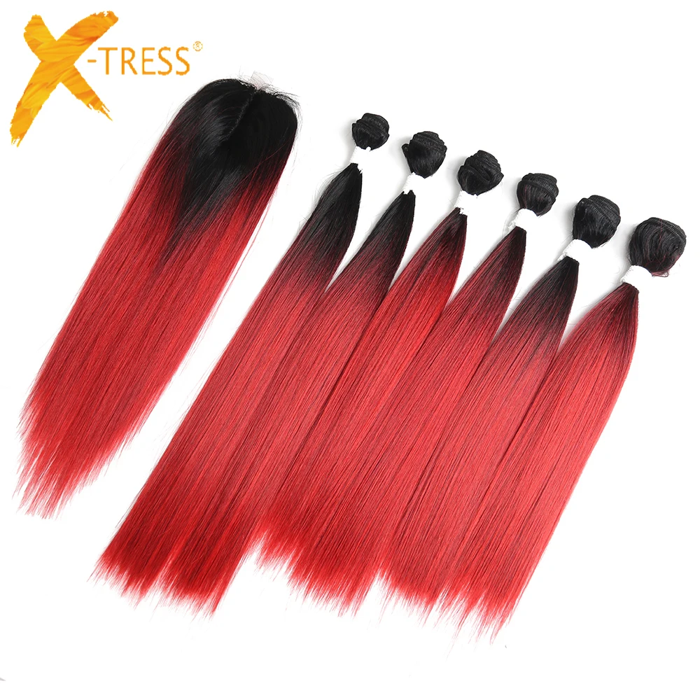 Яки прямые синтетические пряди волос с закрытием 14-18 дюймов X-TRESS высокотемпературное волокно Омбре красный цвет пучок волос