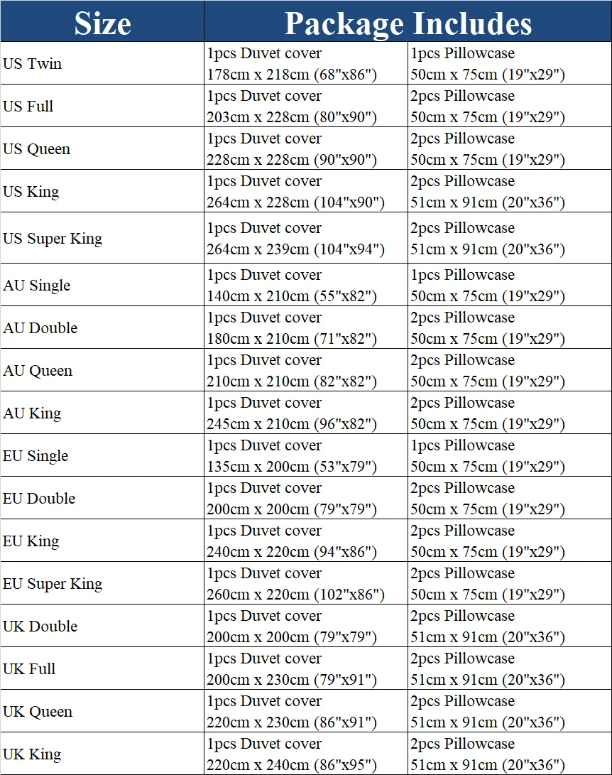 ФлуоресцентныйРазмер СШАСША Twin: 1 пододеяльник 68 "x 86"(172x218 см),1 наволочка 19 "x 29"(50x75 см).США: 1 пододеяльник 79 "x 90"(200x229 см) , 2 наволочки 19 "x 29"(50x75 см).Королева США: 1 пододеяльник 90 "x 90"(228x228 см), 2 наволочки 19 "x 29"(50x75 см).Король США: 1 Пододеяльник 102 "x 90"(259x229 см), 2 наволочки 20 "x 36"(51x91 см).US Cal King:1 пододеяльник 104 "x 94"(264x239 см), 2 наволочки 20 "x 36"(51x91 см)ФлуоресцентныйЕвропейский размерЕвропейский стандарт: 1 пододеяльник 53 "x 79"(135x200 см),1 наволочка19 "x 29"(50x75 см).Двойной европейский размер: 1 пододеяльник 79 "x 79"(200x200 см) , 2 наволочки 19 "x 29"(50x75 см).Европейский Король: 1 пододеяльник 94 "x 86"(240x220 см) , 2 наволочки 19 "x 29"(50x75 см).Супер король ЕС: 1 Пододеяльник 102 "x 86"(260x220 см) , 2 наволочки 19 "x 29"(50x75 см).ФлуоресцентныйАвстралийский РазмерAU Single : 1 пододеяльник 55 "x 82"(140x210 см),1 наволочка19 "x 29"(50x75 см).AU Double : 1 пододеяльник 71 "x 82"(180x210 см) , 2 наволочки 19 "x 29"(50x75 см).AU Queen: 1 пододеяльник 83 "x 83"(210x210 см) , 2 наволочки 19 "x 29"(50x75 см).AU King: 1 пододеяльник 95 "x 83"(245x210 см), 2 наволочки 19 "x 29"(50x75 см).