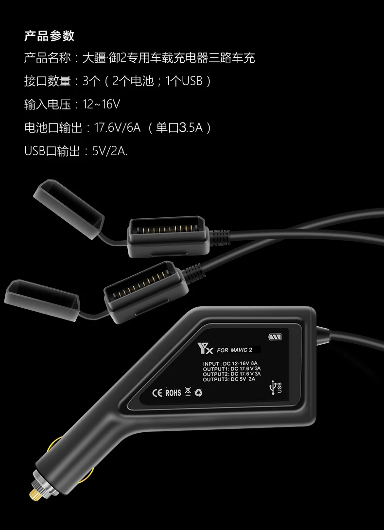 3 в 1 Автомобильное зарядное устройство с USB для MAVIC 2, может одновременно заряжать 2 шт батареи и 1 шт пульт дистанционного управления (или смартфон, планшет)