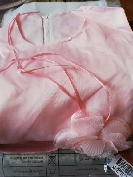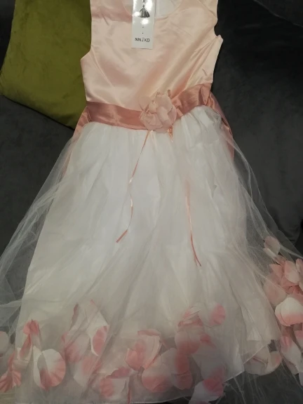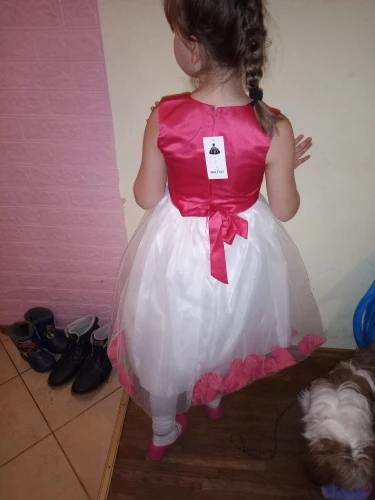 Красивое платье, цвет соответствует. Размер 150 на рост 136см (8лет) до середины икры. Подъюбник не нужен, пышное как на фото. Лепестки на подоле сбиваются в кучу, нужно равномерно распределять. Ребёнок доволен, ничего не чешется на голое тело, что приятно радует.