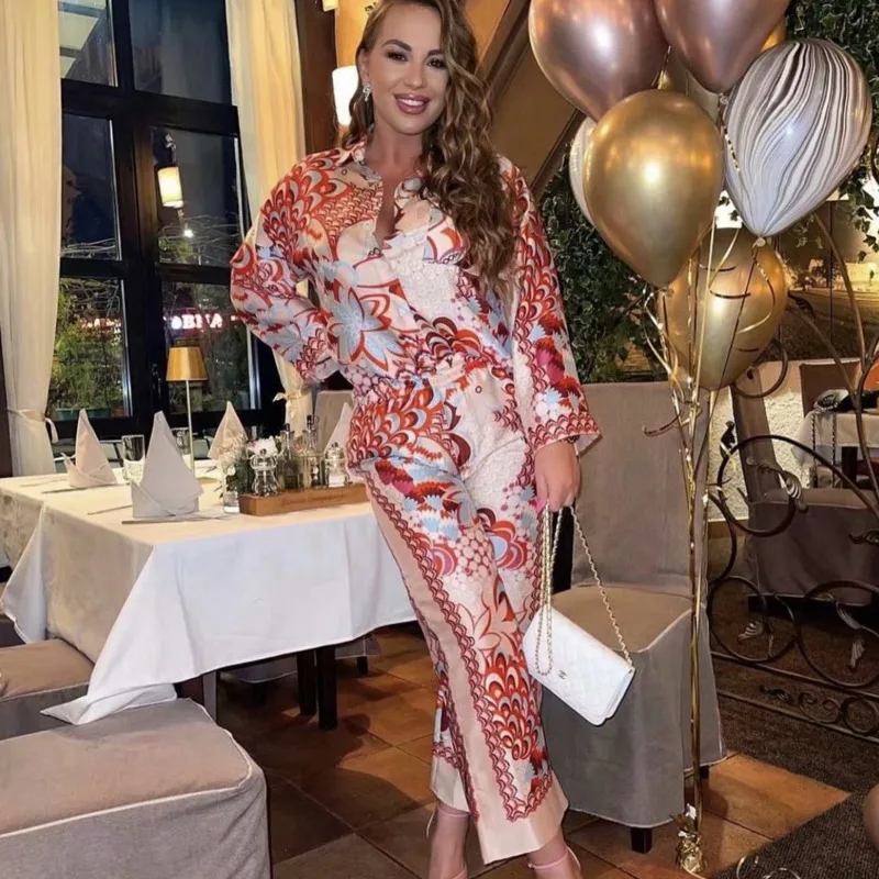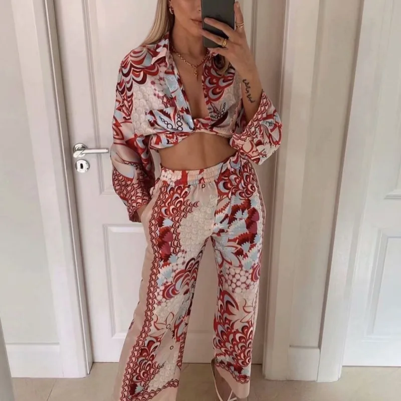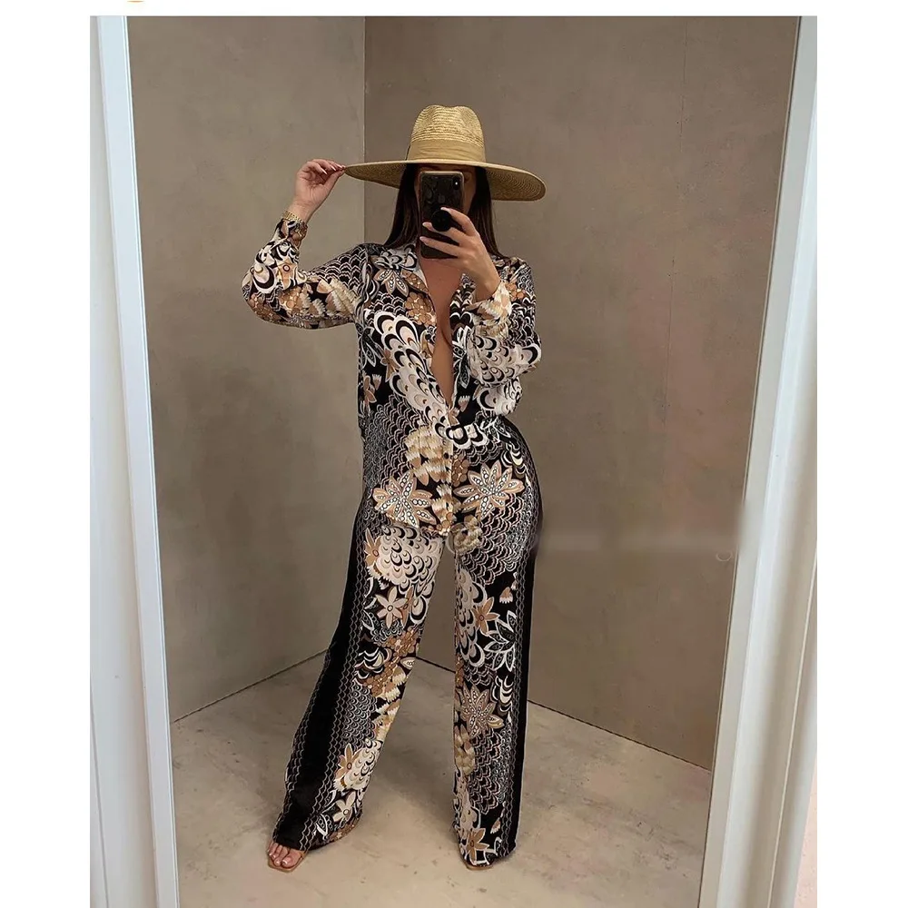 Женский однобортный комплект из 2 предметов, Осенний Повседневный блейзер с лацканами и принтом и эластичные брюки, комплект из 2 предметов с широкими штанинами